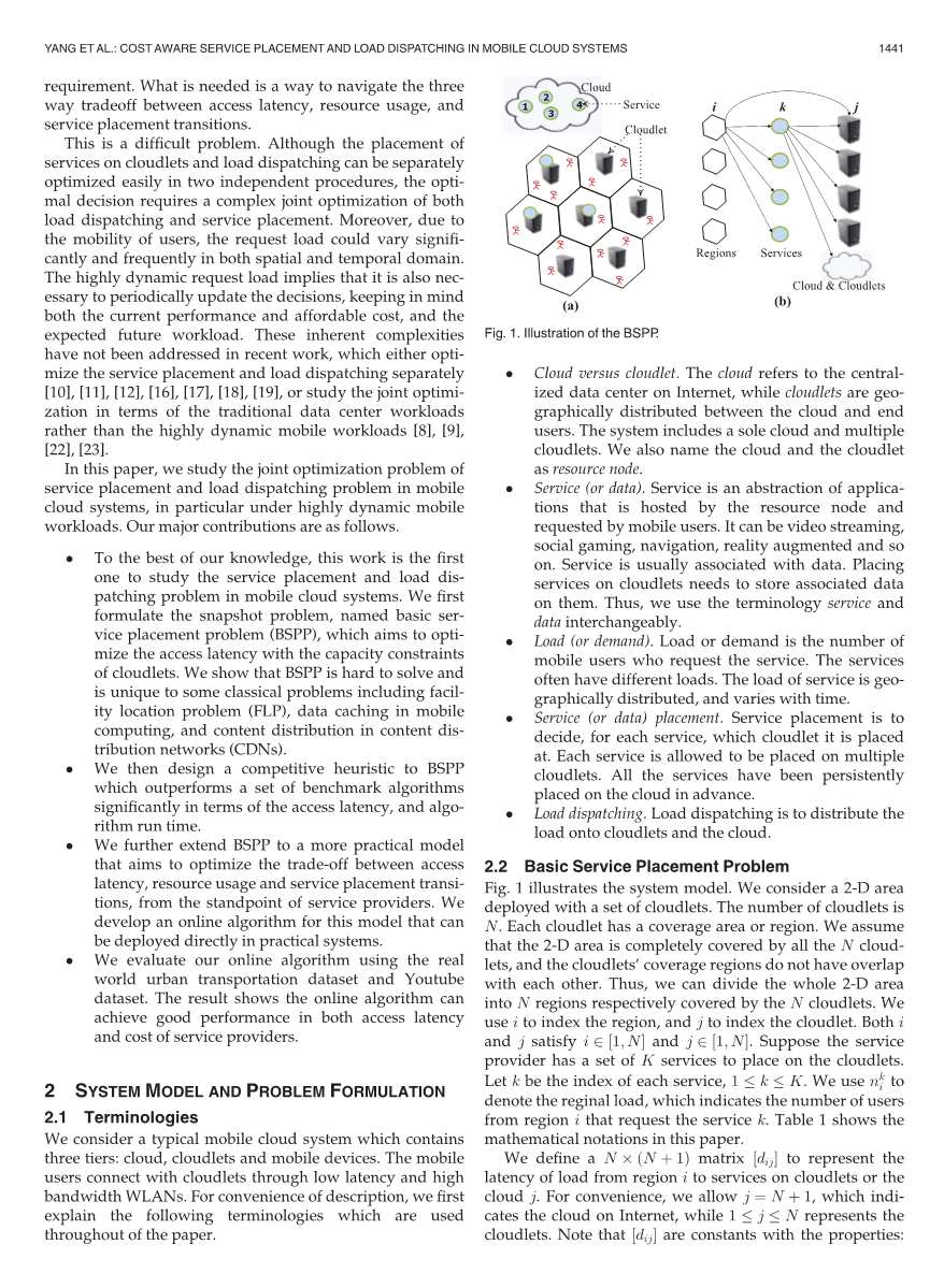 • 就我们所知,这个工作是第一个研究移动云系统中的服务放置和负载均衡的工作。我们首先规范了拍快照问题,命名为基本服务放置问题(BSPP),这个问题目的是在微云容量限制的条件下最优化访问延迟。我们发现BSPP问题很难解决,它对一些经典问题来说是唯一的,例如设施定位(FLP)、移动计算中的数据缓存和内容分布式网络(CDNs)。