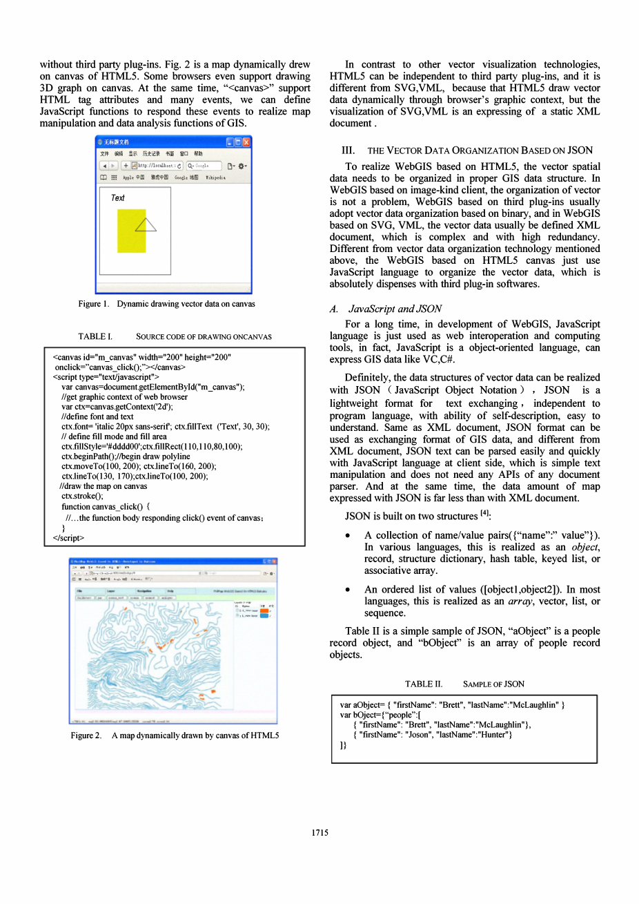 本文提出了一种新的WebGIS矢量可视化方法,使WebGIS无需第三方插件软件即可支持矢量可视化,提出了一种基于JSON的矢量数据组织方法,适用于基于HTML5的WebGIS。 总之,基于HTML5,JSON和Ajax以及Web服务的新型WebGIS平台具有一些优势: