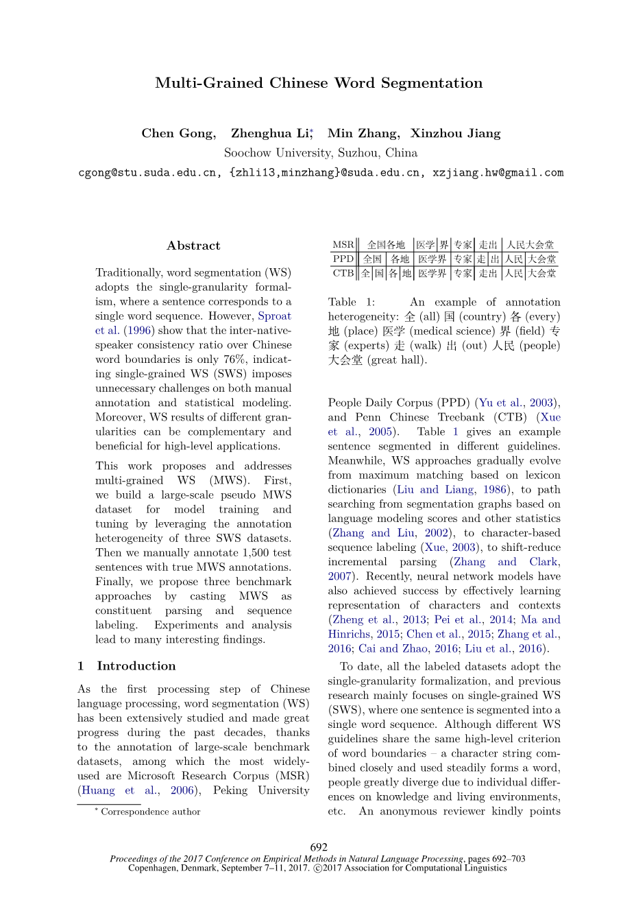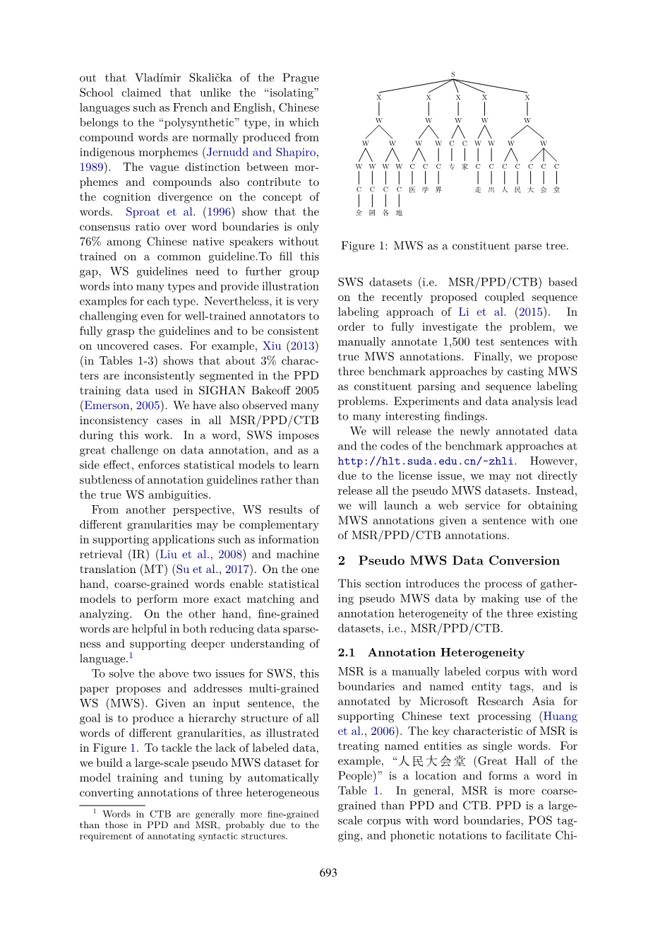 到目前为止,所有标记的数据集都采用单粒度形式化,而以前的研究主要集中在单粒度WS(SWS)上,其中一个单词序列中存在一个句子。虽然不同的WS准则具有相同的高级语言边界标准 - 一个字符串紧密结合并且使用稳定形成一个词,但人们在知识和生活环境等方面会大大降低个体差异。一位不愿透露姓名的评论者指出,布拉格学派的Vladiacute;mirSkalička声称,与法语和英语等“隔离”语言不同,中国人属于“多合成”类型,其中复合词通常是从本地语素中产生的。语素和化合物之间的模糊区别也促成了对词语概念的认知分歧。 Sproat等人的研究表明,中国母语人士的共识比例在没有经过共同指导方面培训的情况下仅为76%。为了填补这一空白,WS准则需要进一步将词汇分为多种类型,并为每种类型提供说明示例。尽管如此,即使是训练有素的注释者完全掌握准则并在未发现的案例中保持一致,这也是非常具有挑战性的。例如,Xiu(2013)(表1-3)显示,在SIGHAN Bakeoff 2005中使用的PPD训练数据中,大约3%的字符不一致地被分割。在这项工作中,我们还观察到所有MSR / PPD / CTB中存在许多不一致情况。总之,SWS对数据注释提出了很大的挑战,并且作为副作用,强制统计模型学习注释准则的微妙性,而不是真正的WS含糊不清。