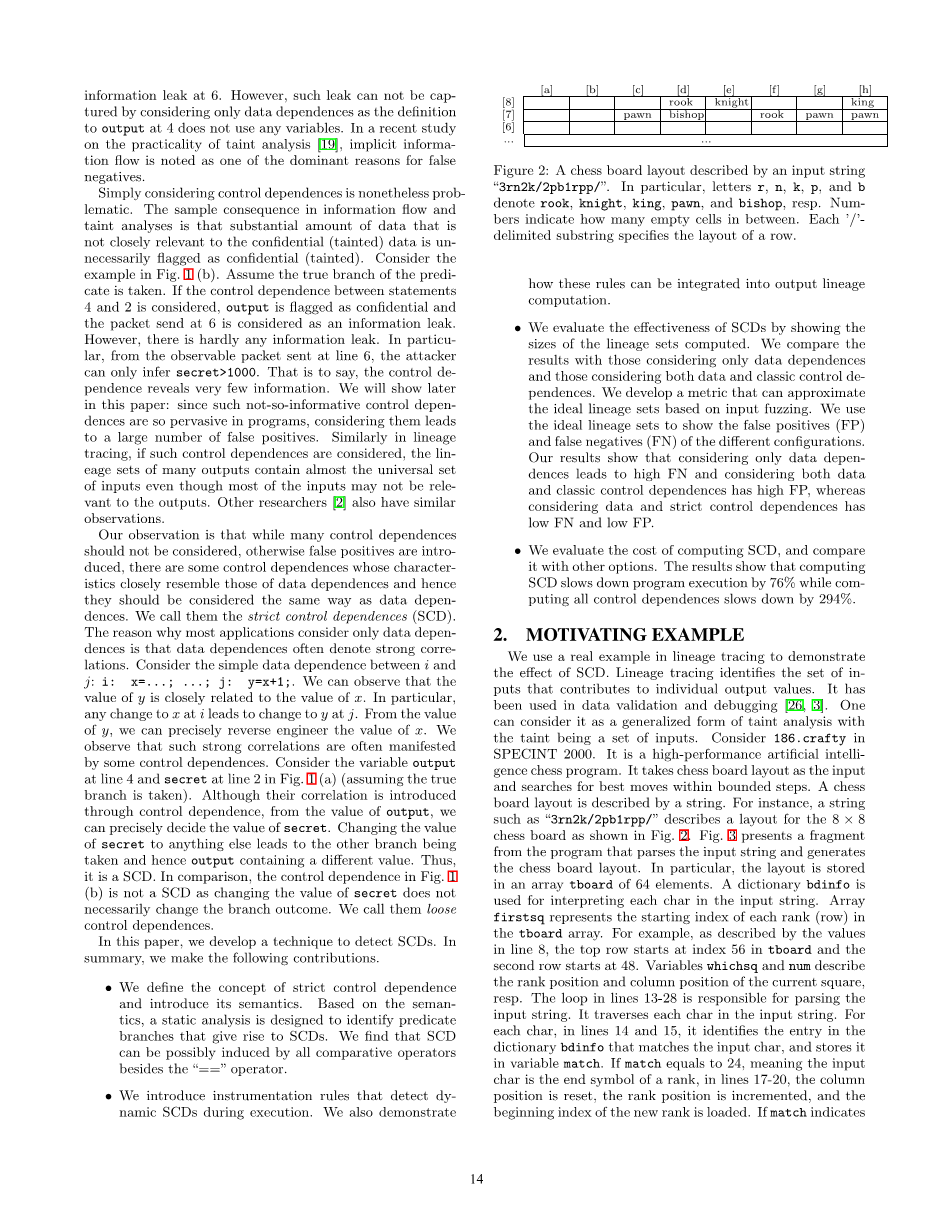 我们使用了一个真实的例子来演示SCD的效果。谱系追踪识别对单个输出值作出贡献的输入集。它已用于数据验证和调试[26,3]。我们可以把它看作是一种广义形式的污染分析,因为污染是作为一组输入。考虑SPECINT 2000 中的186.crafty。它是一个高性能的人工智能国际象棋程序。它将棋盘布局作为输入,并在有界的步骤中搜索最佳的移动。棋盘布局是用字符串来描述的。例如,一个字符串如“3 rn2k / 2 pb1rpp /”描述了一个布局的8times;8棋盘,如图2所示。图3展示了程序的一个片段,它解析输入字符串并生成棋盘布局。特别是,布局存储在64个元素的数组tboard中。字典bdinfo用于解释输入字符串中的每个字符。数组firstsq表示tboard数组中每个级别(行)的起始索引。例如,正如第8行中的值所描述的,第一行在tboard中的索引56开始,第二行从48开始。变量Whichsq和num描述当前正方形的行位置和列位置。第13-28行中的循环负责解析输入字符串。它遍历输入字符串中的每个字符。对于第14和第15行中的每个char,它识别与输入char匹配的dictionary bdinfo中的条目,并将其存储在变量match中。如果match等于24,意味着输入char是rank的结束符号,在第17-20行中,列位置被重置,rank位置递增,新的rank的开始索引被加载。如果match表明输入的字符是一个数字,在第22和23行中,那么当前的方块将根据指定的空闲方块数进行更新。如果两种情况都不正确,那么输入字符必须是设置在第26行的数组元素。