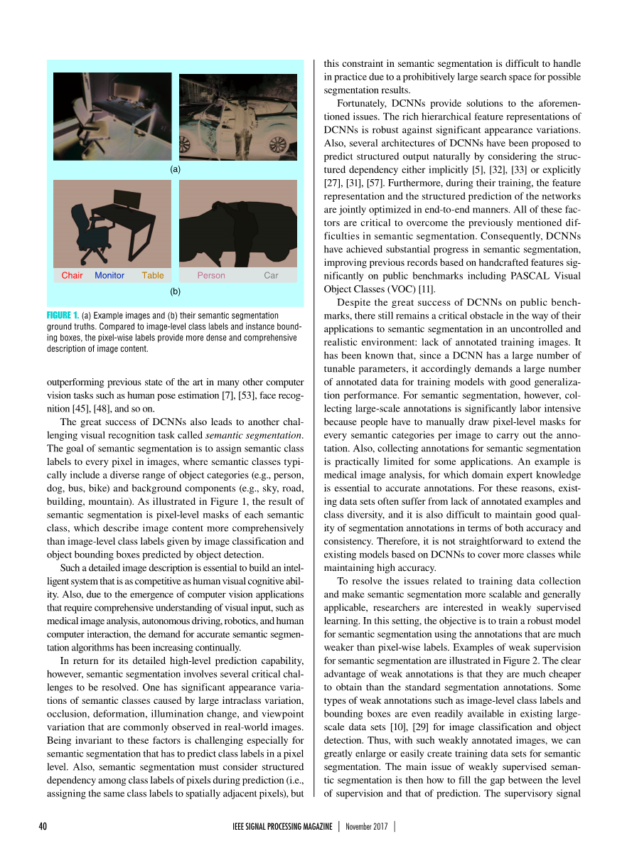 图1.(a)示例图像和(b)它们的语义分割基础事实。 与图像级别类别标签和实例边界框相比,像素级标签提供对图像内容的更密集和全面的描述。