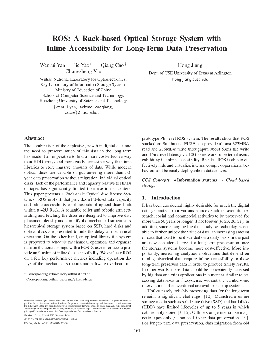 数字数据的爆炸性增长与长期保存大量数据的需求的结合使得必须找到比HDD阵列更具成本效益的方法,并且比磁带库更容易访问的方式来存储大量数据的。虽然现代光盘能够保证在不迁移的情况下保存超过50年的数据,但单个光盘相对于HDD或磁带的性能和容量的缺乏显著限制了其在数据中心的使用。本文提出了一种机架级光盘库系统(简称为ROS),它提供了PB级总容量和内置可访问性,可以在内置于42U机架内的数千个光盘上实现。分离和取出盘的可旋转的转笼和机械臂设计用于提高盘放置密度并简化机械结构。提出了基于SSD,硬盘和光盘的分层存储系统,以隐藏机械操作的延迟。另一方面,提出了一种光盘库文件系统来安排机械操作,并使用POSIX用户界面在分层存储上组织数据,以提供内联数据可访问性的错觉。