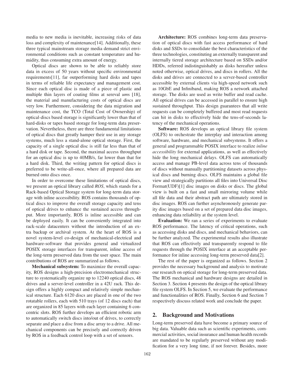本文的其余部分安排如下。 第2节提供必要的背景和分析,以激励我们对长期保存数据的光存储研究。 ROS机械和硬件设计在第3节中有详细介绍。第4节介绍了光盘库文件系统OLFS的设计。 在第5节中,我们评估了ROS的性能和功能。 最后,第6节和第7节分别讨论相关工作,并总结本文。