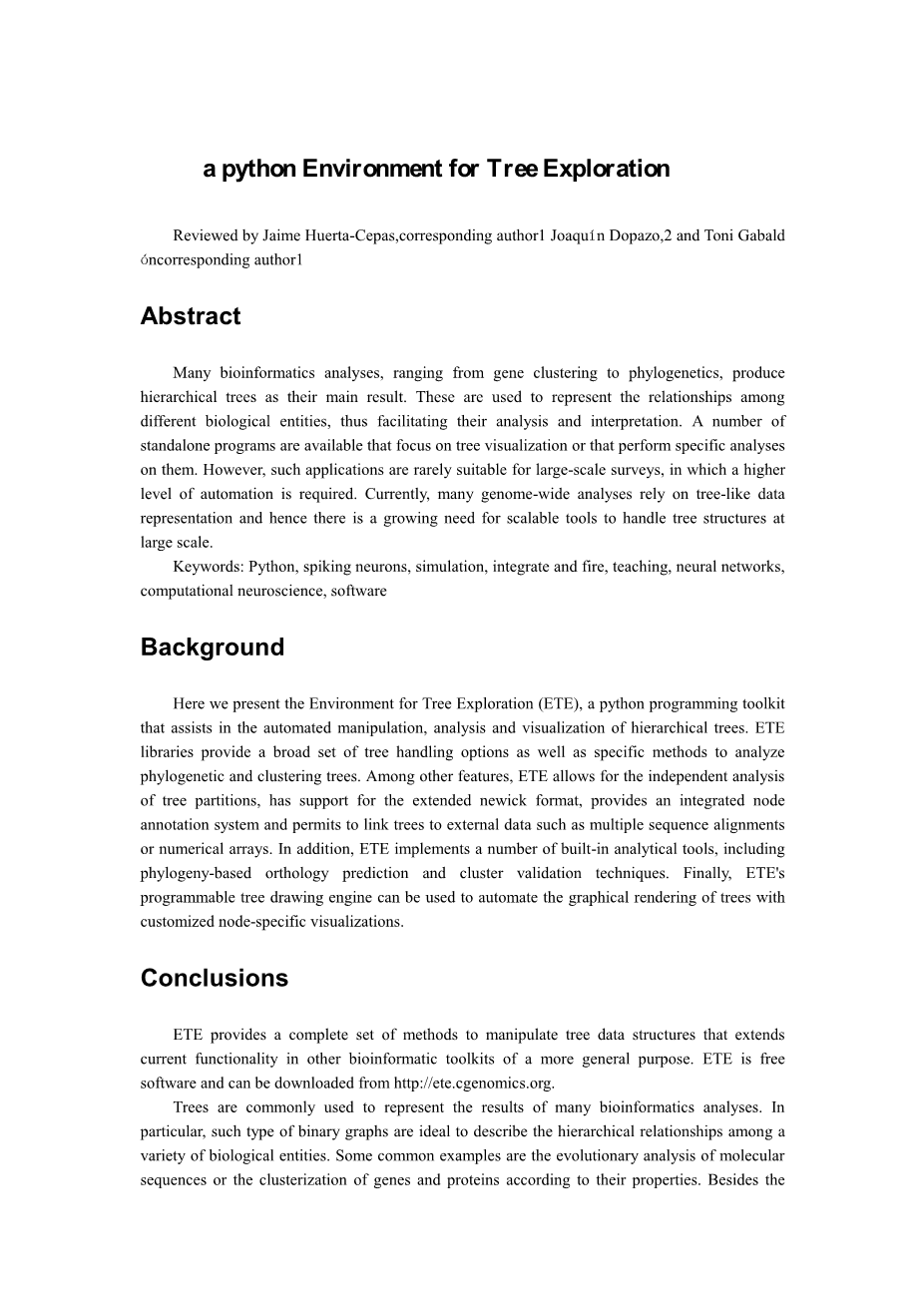 目前,ETE工具包用于各种项目,包括GEPAS[17]、Phylemon[18]和[15]。可以通过http://ete.cgenomics.org访问ETE包和文档。