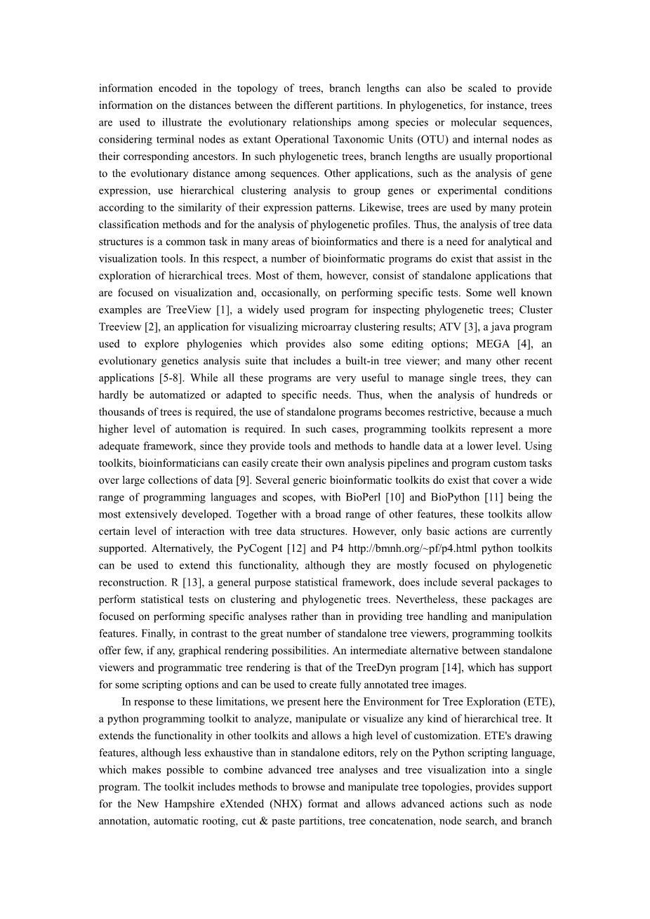 树木通常用来表示许多生物信息学分析的结果。特别是,这种类型的二进制图是描述各种生物实体之间的层次关系的理想方法。一些常见的例子是分子序列的进化分析,或者是根据它们的性质对基因和蛋白质的集群化。除了在树的拓扑结构中编码的信息之外,分支长度也可以被缩放以提供关于不同分区之间的距离的信息。例如,在系统遗传学中,树木被用来说明物种或分子序列之间的进化关系,将终端节点看作现存的可操作的分类单元(OTU)和内部节点作为其相应的祖先。在这种系统进化树中,枝长通常与序列之间的进化距离成正比。其他应用,如基因表达分析,根据其表达模式的相似性,对基因或实验条件进行层次聚类分析。同样地,树木也被许多蛋白质分类方法和对系统发育特征的分析所使用。因此,对树状数据结构的分析是生物信息学许多领域的共同任务,需要分析和可视化工具。在这方面,有一些生物信息学项目确实存在,有助于对等级树的探索。然而,它们中的大多数都是独立的应用程序,这些应用程序集中于可视化,偶尔还会执行特定的测试。一些著名的例子是TreeView[1],这是一种广泛使用的用于检测系统发育树的程序;集群Treeview[2],一种可视化微阵列聚类结果的应用;ATV[3],一个用于探索系统的java程序,它提供了一些编辑选项;MEGA[4],一个进化遗传学分析套件,包含一个内置的树查看器;还有许多其他最近的应用[5-8]。虽然这些程序对于管理单一的树非常有用,但是它们很难自动化或适应特定的需求。因此,当需要对数百或数千棵树进行分析时,独立程序的使用就变得非常严格,因为需要更高的自动化水平。在这种情况下,编程工具包代表了一个更充分的框架,因为它们提供了在较低层次处理数据的工具和方法。使用工具包,生物信息专家可以很容易地创建他们自己的分析管道和程序定制任务,而不是大量的数据集合[9]。有几种通用的生物信息学工具包,涵盖范围广泛的编程语言和范围,其中BioPerl[10]和BioPython[11]是最广泛开发的。这些工具箱与其他许多特性一起,允许与树数据结构进行一定程度的交互。但是,目前只支持基本操作。或者,PyCogent[12]和P4 http://bmnh.org/~pf/ P4 .html python工具包可以用来扩展这个功能,尽管它们主要集中在系统的重建上。R[13]是一个通用的统计框架,它包含几个用于对集群和系统树进行统计测试的包。不过,这些包的重点是执行特定的分析,而不是提供树处理和操作特性。最后,与大量独立的树查看器相比,编程工具包几乎没有提供任何图形化的呈现可能性。独立查看器和编程树呈现之间的中间选择是TreeDyn程序[14],它支持一些脚本选项,可以用来创建完全注释的树图像。