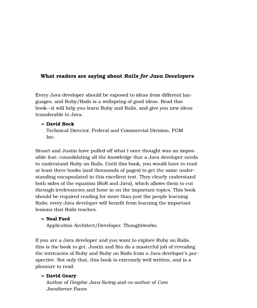 为什么Ruby没有为模块指定一个命名方案 Java程序员被强烈建议在包名的开头反写域名。所以按照这个规定,Apache Commons Lang项目内的代码文件就会以org.apache.commons.lang开头。Ruby就没有类似的指导方案,所以模块(module)往往会根据其具体功能或商标等其他原因来命名。比如,Rails MVC controller代码就编写在Action-Controller模块内。Ruby程序员不需要那么担心命名冲突主要出于以下三个理由: ·在类或模块级别的名称冲突是比较容易解决的。Ruby的类安全依赖于“鸭子类型”(duck typing),而几乎与类或模块名称没有关系。 ·“鸭子类型”依赖于方法名,所以你可能认为命名冲突会在这个层级出现。但其实,Ruby中可以很容易地重命名或取消定义方法,所以在实际操作中,方法名冲突很少导致问题。 ·Ruby的名称冲突较少还因为Ruby程序使用更少的名字来开始。无论是在代码行数方面还是在使用名称的数量方面,动态类型语言往往都比静态类型语言更简洁。 另外值得注意的是,Java和Ruby对命名空间名称的要求其实都没有那么严格。一些流行的Java软件包都没有按照反写域名的规则来命名(比如 junit.framework)。我们(笔者)有时会使用Relevance作为Ruby程序中的顶层命名空间。 这当然不是我们的域名,但它是基于我们的组织名称的。我猜想这可能是受到了Java的影响hellip;hellip; |