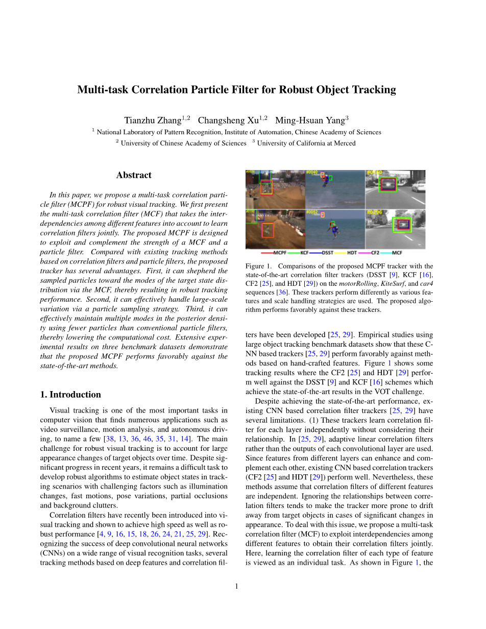 尽管实现了最先进的性能,但现有的基于CNN的相关滤波器跟踪器[25,29]有一些局限性。(1)这些跟踪器独立地学习每层的相关滤波器,而不考虑它们之间的关系。在[25,29]中,使用自适应线性相关滤波器而不是每个卷积层的输出。由于来自不同层的特征可以相互增强和补充,所以现有的基于CNN的相关跟踪器(CF2 [25]和HDT [29])表现良好。尽管如此,这些方法假定不同特征的相关滤波器是独立的。忽略相关滤波器之间的关系往往会使跟踪器更容易在外观发生重大变化的情况下远离目标物体。为了解决这个问题,我们提出了一个多任务相关滤波器(MCF)来利用不同特征之间的相互依赖性来共同获得它们的相关滤波器。这里,学习每种特征的相关滤波器被视为一项个人任务。如图1所示,MCF实现比CF2和HDT更好的性能在KiteSurf序列中。(2)这些跟踪器[25,29]不会处理好比例尺变化。最近Danelljan等人提出了使用HOG特征的自适应多尺度相关滤波器的DSST方法[9]来处理目标物体的尺度变化。但是,自适应多尺度策略不利于基于CNN特征和相关滤波器的跟踪方法[25,29](见第4节)。为了克服这个问题,我们采用粒子滤波器[1,19]来处理大范围的变化。在基于粒子的跟踪方法中,可以用密集的采样来覆盖发生大范围变化的目标物体的状态空间。如图1所示,HDT和CF2方法不能很好地追踪car4序列中具有尺度变化的目标对象,但是所提出的算法通过使用粒子滤波器而表现良好。