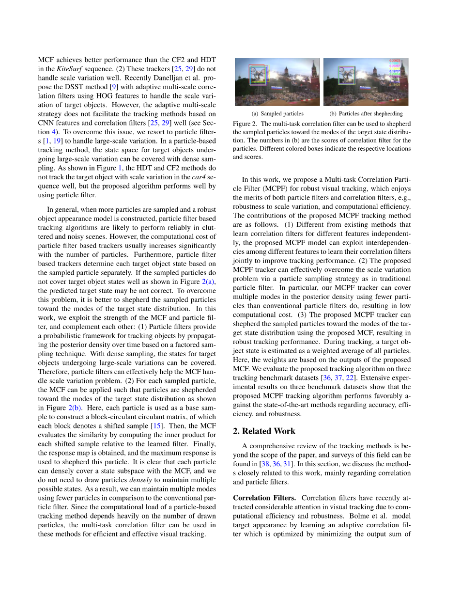 对跟踪方法的全面审查超出了论文的范围,对此领域的调查可以在[38,36,31]中找到。在本节中,我们将讨论与本工作密切相关的方法,主要涉及相关性和颗粒过滤器。