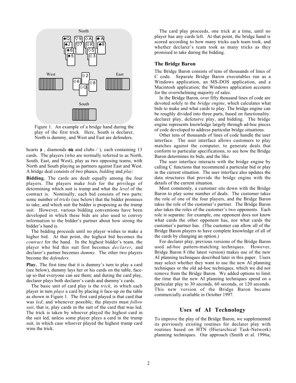对于庄家来说,以前版本的“桥牌男爵”都使用了Ad-hoc模式匹配技术。 不同的是,“桥牌男爵 8”(最新版本)应用了本文后面介绍的新的AI规划技术。但是我们并没有从“桥牌男爵”中删除旧的技术,用户可以选择使用新的AI规划技术也可以选择旧的Ad-hoc技术。 我们还增加了一些选项,以使得新技术在特定牌局下的出牌时间限制在30秒,60秒或120秒内。这个新版本的“桥牌男爵”于1997年10月上市。