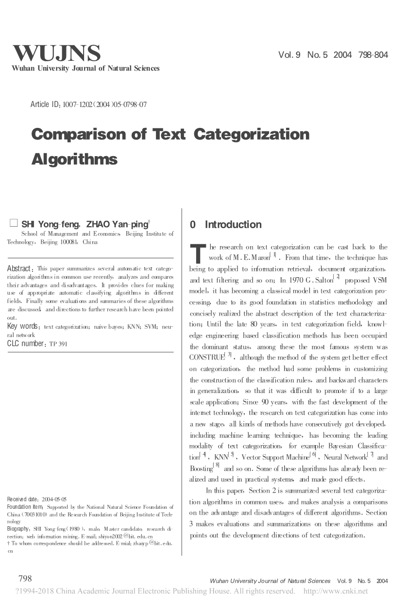 对文本分类的研究可以追溯到M.E.Maron的工作。从那时起,该技术已经应用于信息检索,文档组织,文本过滤等等。1970年,Salton提出了VSM模型,由于其在统计方法学方面具有良好的基础,并且简洁地实现了文本特征的抽象描述,它已经成为文本分类处理的经典模型;直到80年代后期,在文本分类领域,以知识工程为基础的分类方法一直占据主导地位,其中最有名的系统是CONSTRUE,尽管该方法在分类方面取得了较好的效果,但在定制分类规则的构建上存在一些问题以及其落后的字符泛化,导致其难以大规模推广应用;90年代以来,随着互联网技术的飞速发展,对文本分类的研究进入了一个崭新的阶段,各种方法连续得到发展,包括机器学习技术,已经成为文本分类的主流形式,如贝叶斯分类,KNN,SVM,神经网络和Boosting等。其中一些算法已经在实际系统中得到实现和使用,并取得了很好的效果。本文第2节总结了几种常用的文本分类算法,并对不同算法的优缺点进行了比较分析。第三部分对这些算法进行评价和总结,指出了文本分类的发展方向。