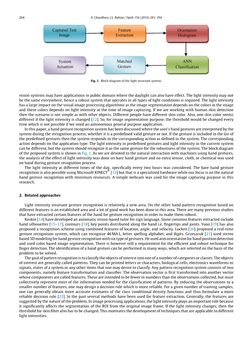在本文中,已经讨论了手势识别系统,其中用户的手势在被解释系统识别过程中,无论是否为预定义的有效手势。如果手势包含在预定义的手势列表中,则系统响应系统中定义的相应动作。相应的操作取决于应用程序类型。预定义手势中的光强度和当前系统中的光强度可以是不同的,但由于系统的鲁棒性应该将其识别为相同的姿势。框图所提出的系统的结构如图1所示。由于我们致力于与使用手势识别的机器的自然交互,在裸露的手势上进行光强度效应的分析,并且在手势识别进行过程中不使用额外的传感器,布或化学品。