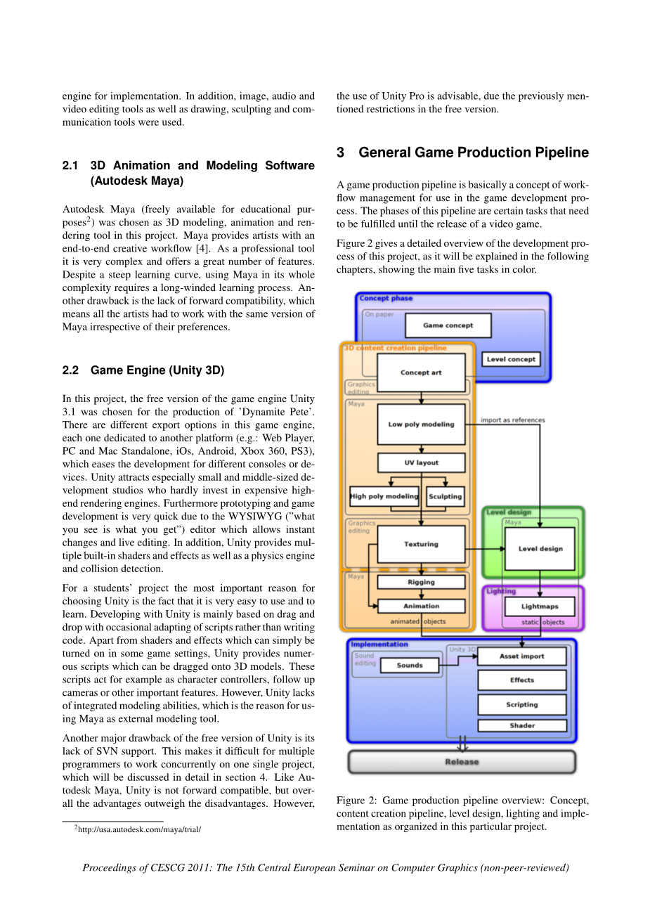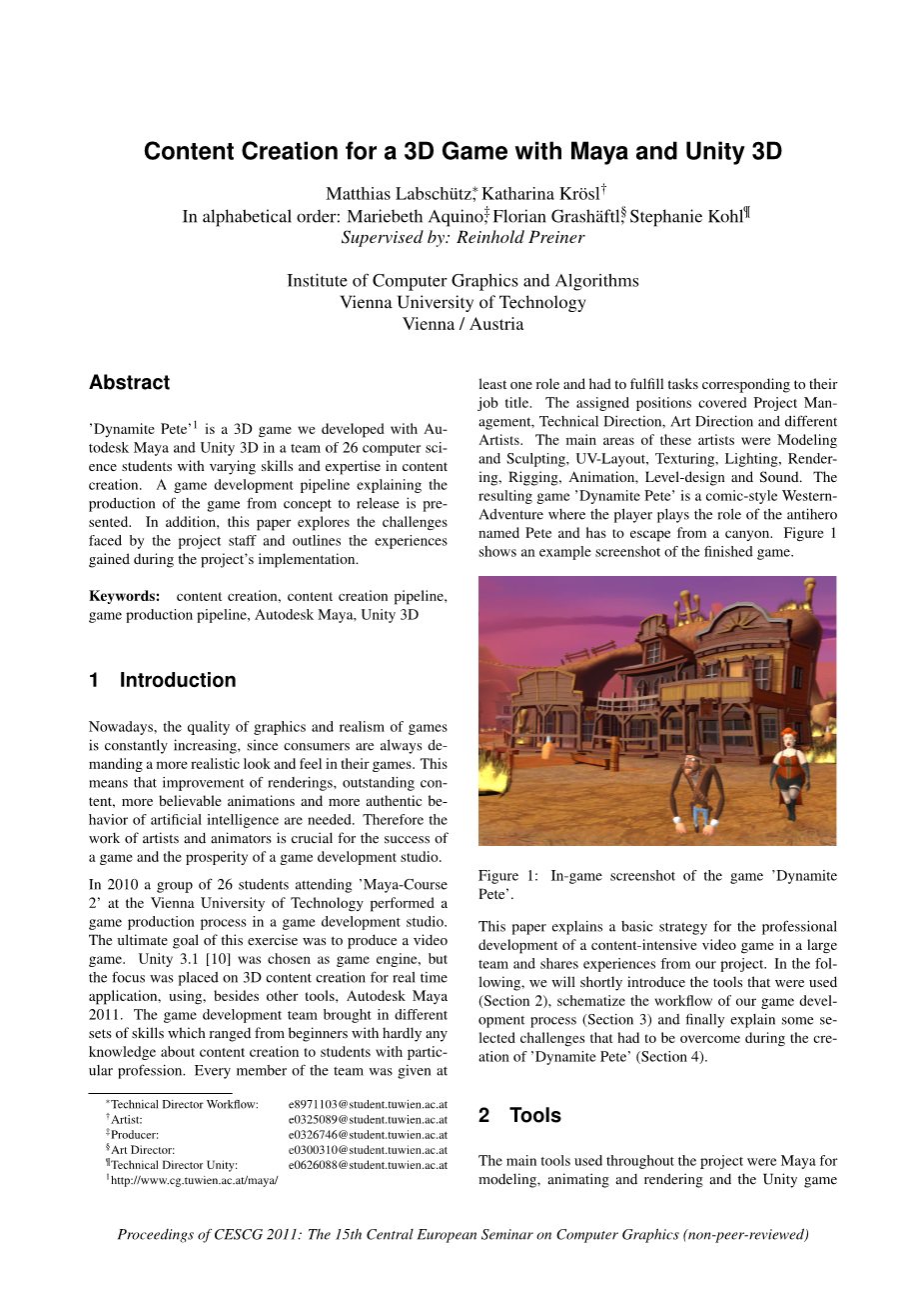2010年,一组26名学生参加在维也纳技术大学的一个游戏开发工作室进行游戏的制作过程的“Maya课程二”。这项工作的最终目标是产生一个视频游戏。Unity3.1被选为游戏引擎,但重点放在3D内容创建的实时应用程序,同时也使用了Autodesk Maya 2011。游戏开发团队带来了不同的组技能,适用范围从从几乎没有任何知识的初学者到经过专业学习的学生。团队的每个成员都被赋予至少一个角色,需要履行相应的其工作头衔任务。分配的职位包括项目管理,技术指导,艺术指导和不同的艺术家。这些艺术家负责的主要范围是造型和雕刻,紫外线布局,材质,灯光,渲染,索具,动画,层次设计和声音。制作出的成果:游戏“炸药皮特”是一个漫画式的西式冒险,玩家扮演一个名为皮特的平民英雄,任务是从峡谷逃脱。图1显示了成品游戏中一个例子的屏幕截图。