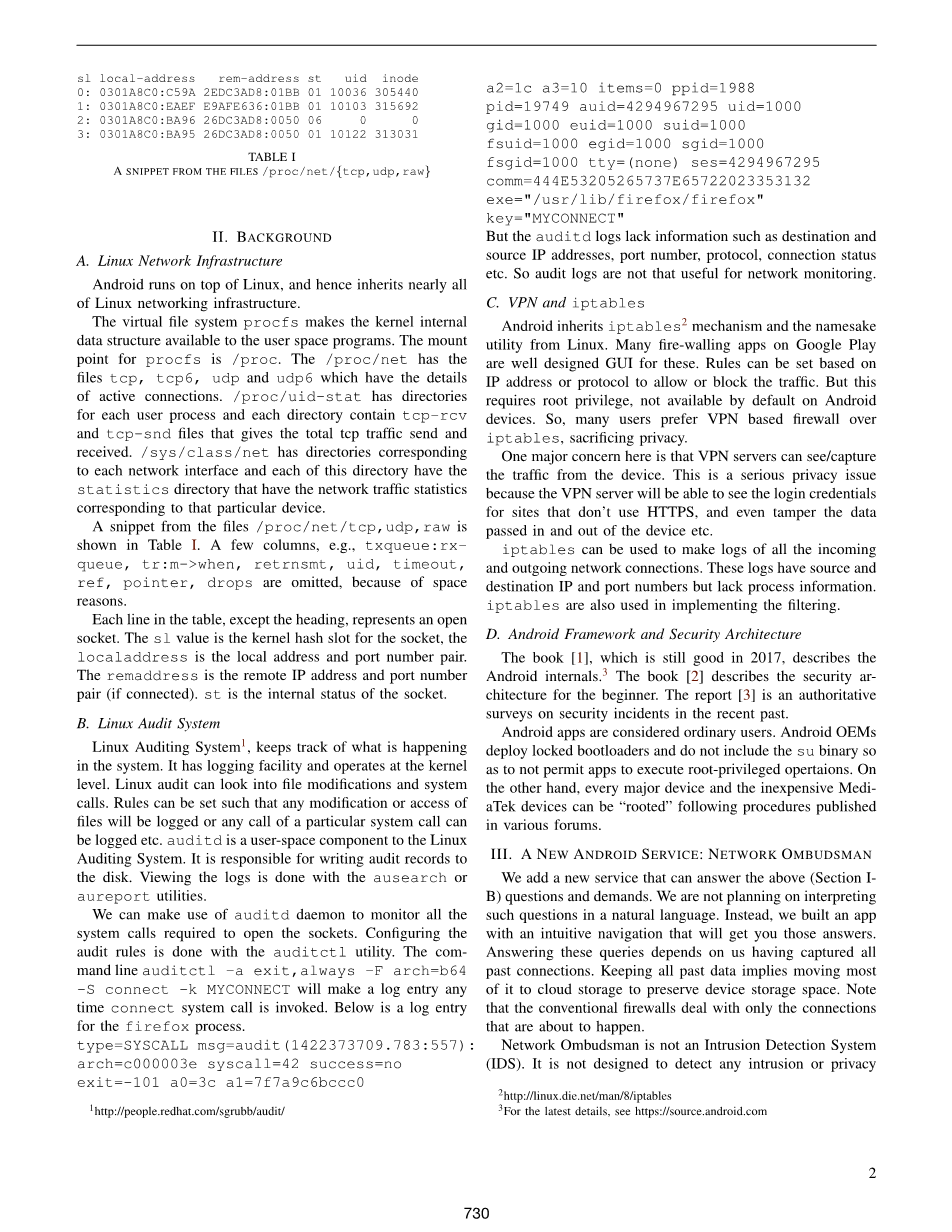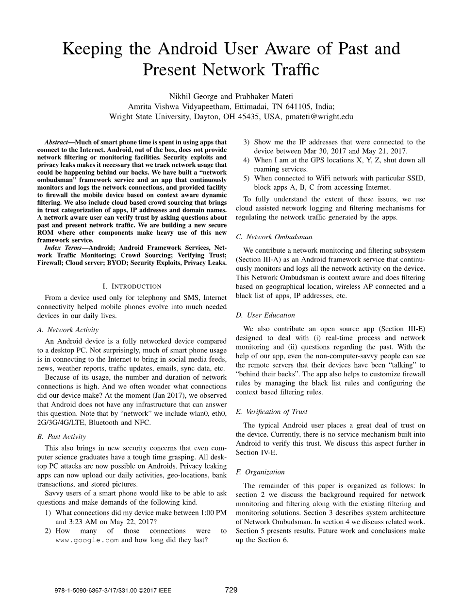 我们提供网络监控和过滤子系统(第III-A节)作为Android框架服务,持续监控和记录设备上的所有网络活动。该网络监察员具有情境感知能力,并根据地理位置,将连接的无线AP和黑名单的应用程序,IP地址等进行过滤。