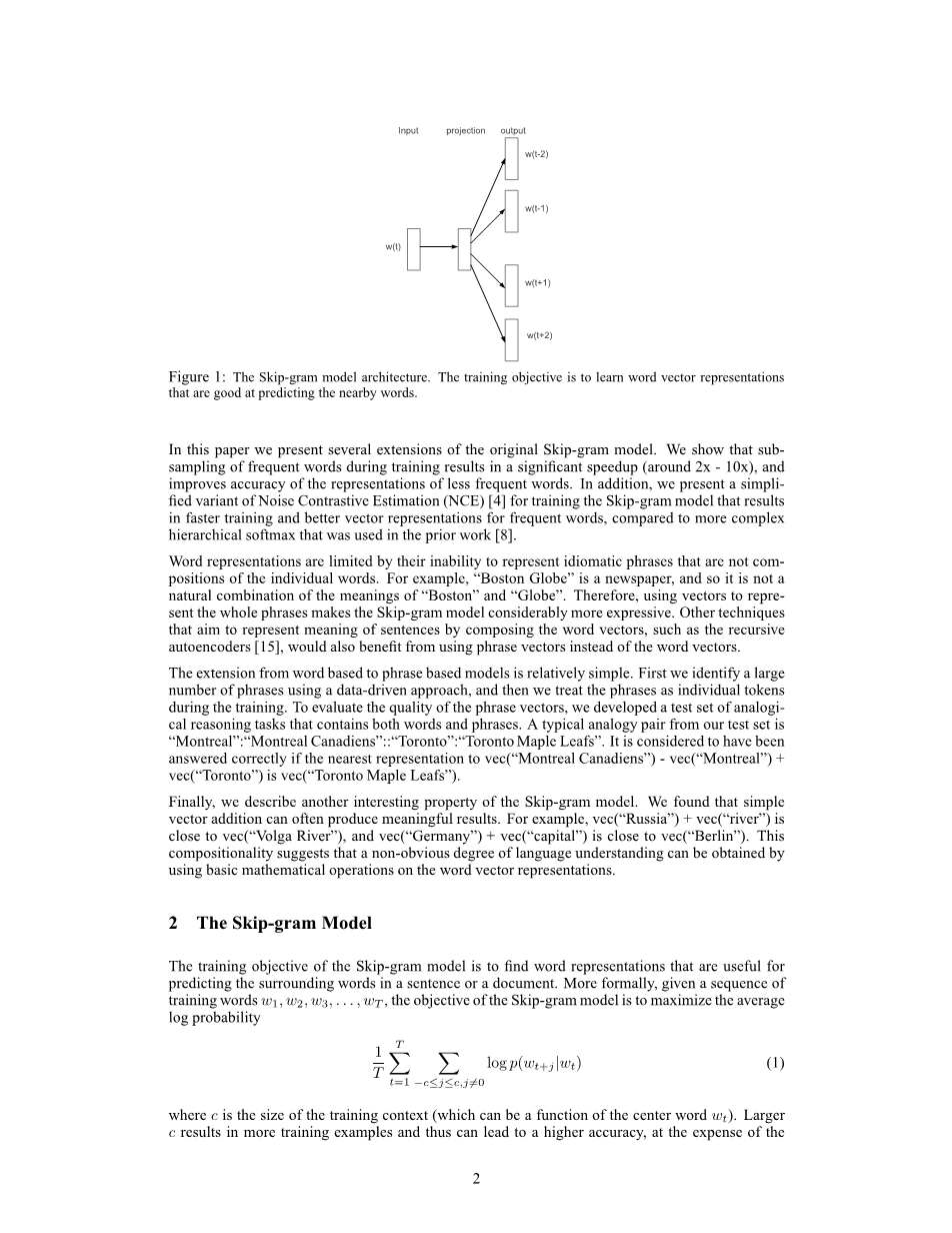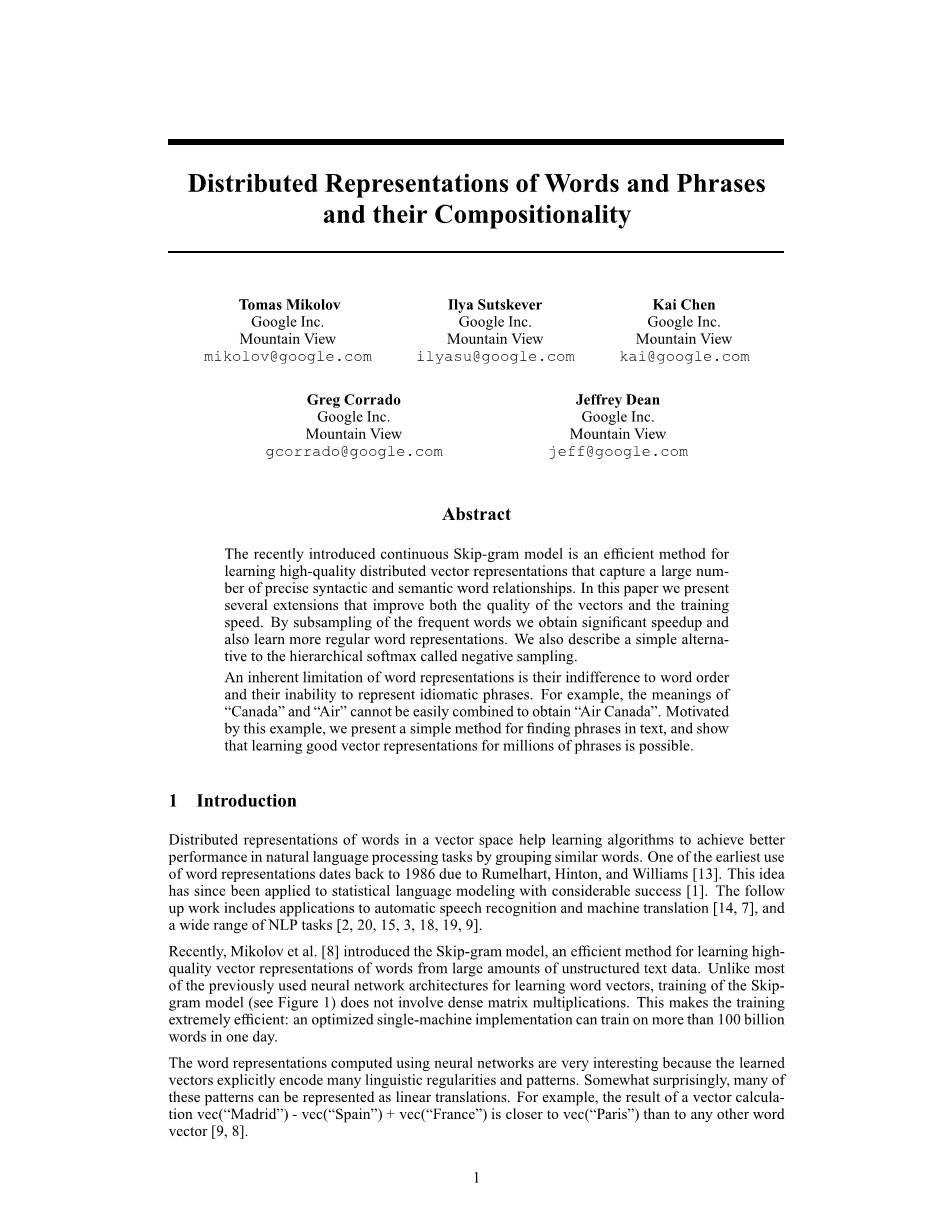 在本论文中我们提出几个Skip-gram模型原型的扩展。我们给出在有效加速中(大约2X-10X)高频词的二次抽样,并且提高了不太高频词代表的准确性。另外,我们提出噪声对比评估(NEC)的简化,用于训练Skip-gram模型,这在快速训练和高频词优质向量表示上有效果。