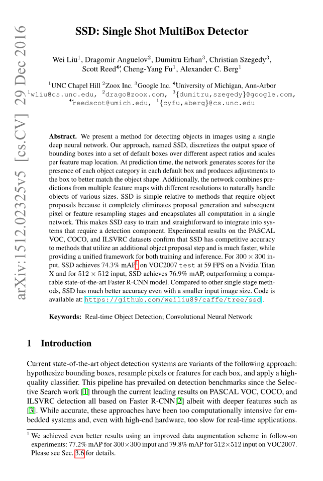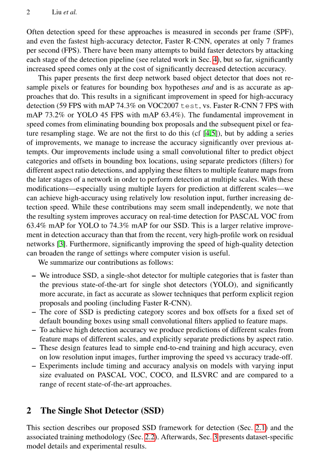 - 实验包括在PASCAL VOC,MS COCO和ILSVRC上评估不同输入大小下模型耗时和精度分析,并与一系列最新的先进方法进行比较。