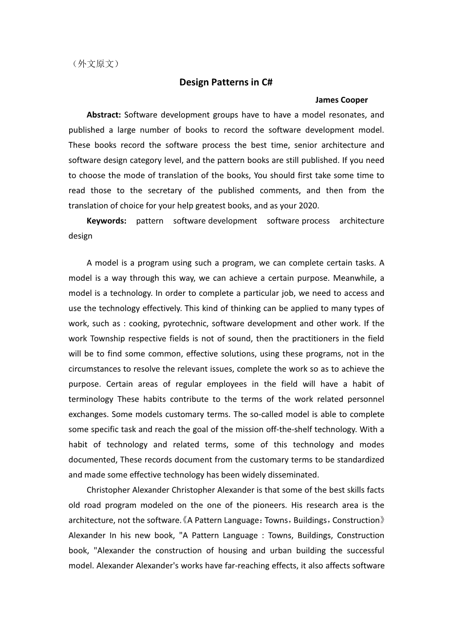 Christopher Alexander 就是把某种技巧的最佳事实方案旧路为模式的先驱者之一。他的研究领域是建筑学,而不是软件。在其著作《A Pattern Language:Towns,Buildings,Construction》一书中,Alexander提出了建造房屋和建设城市的成功模式。Alexander的著作影响深远,因此也影响到软件领域。这部著作之所以能够影响到其他领域,部分也是因为作者对目的具有独特的观察方式。