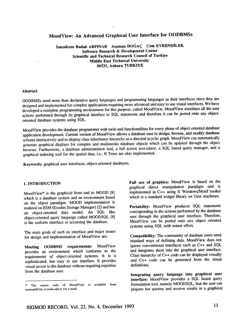 MoodView*是MOOD【8】的图形前端,MOOD是一个基于依赖对象反例环境的数据库系统,它的实现基于ESM(Exodus Storage Manager)[2]并且拥有一个面向对象的数据模型。一个被称为MOODSQL的面向对象的SQL语句是访问数据库的统一接口。