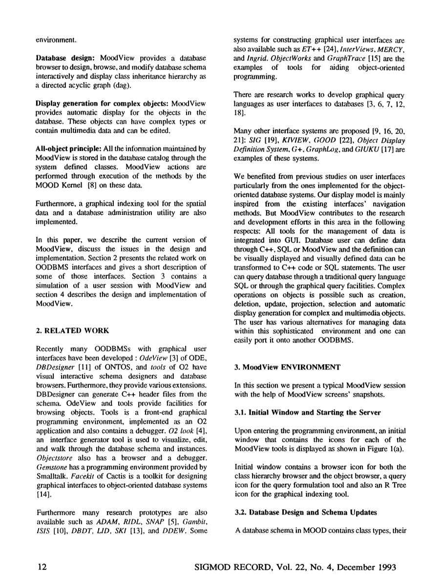 在本文中,我们讨论了MoodView当前的版本和设计中的问题和实现,第2节介绍了在OODBMS接口上相关的努力,并给出这些接口的一个简短的描述。第三节包含一个和MoodView的模拟用户会话。第4节描述了MoodView的设计和实现。