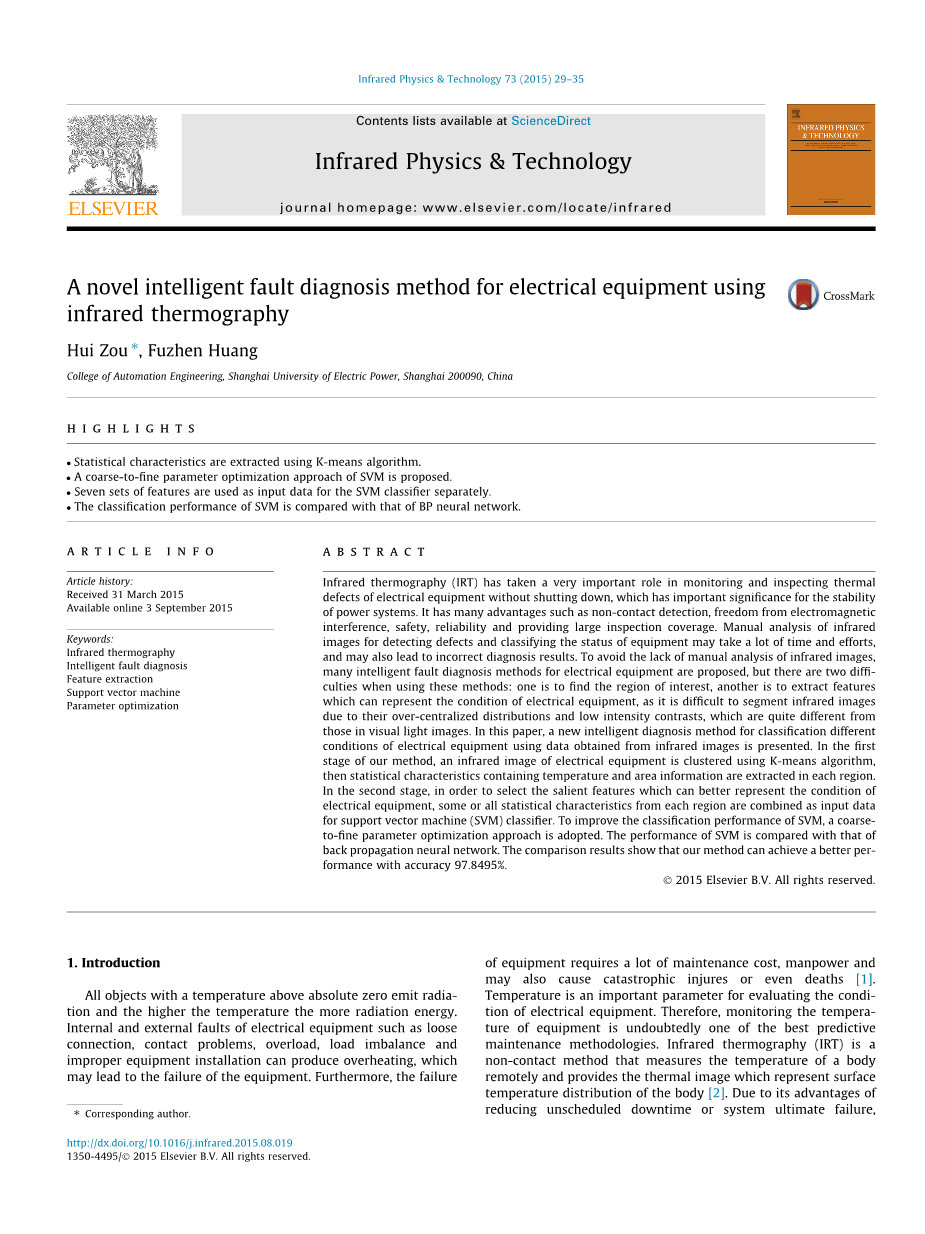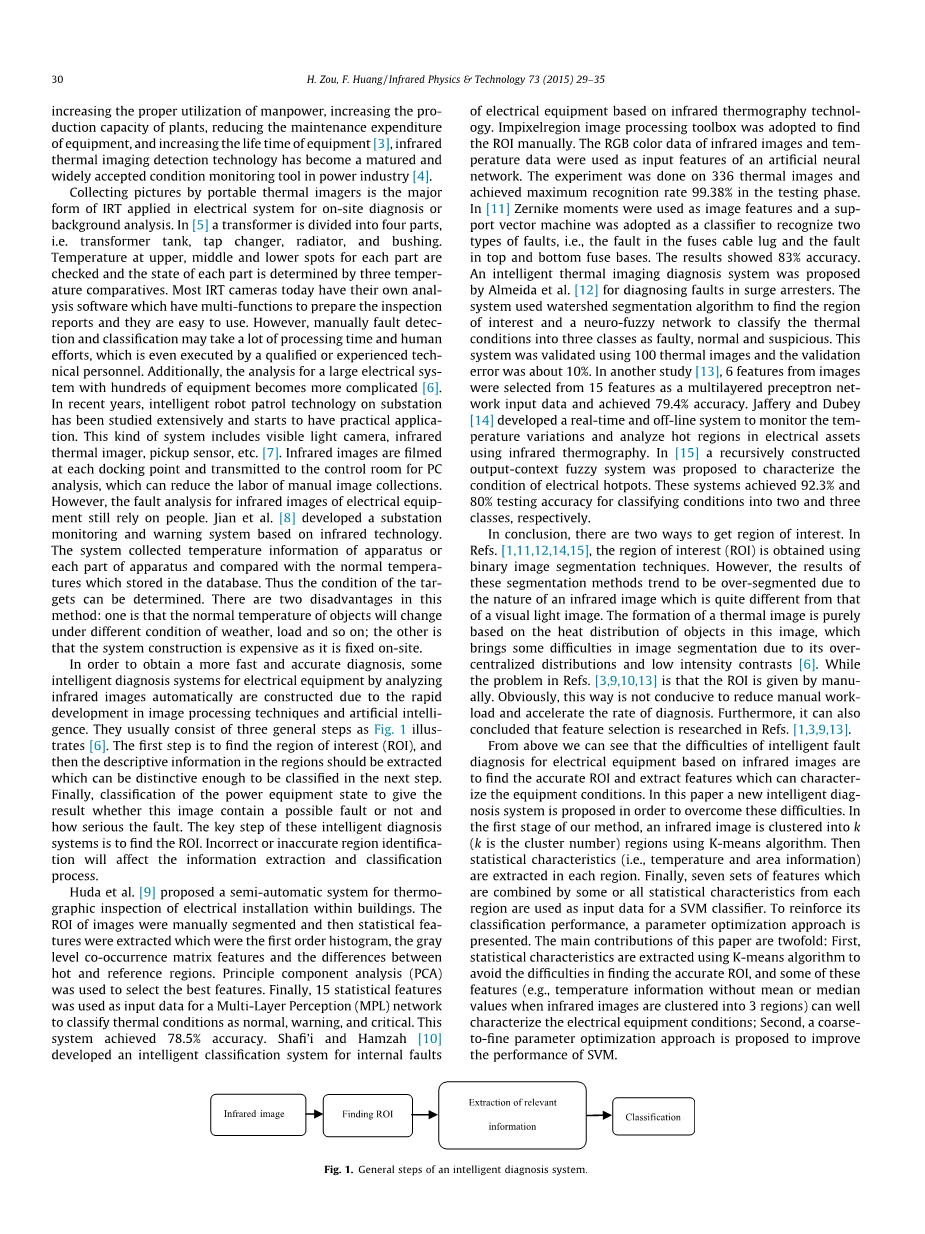 总之,有两种方式获得感兴趣的区域。在参考文献 [1,11,12,14,15]中,使用二值图像分割技术获得感兴趣区域(ROI)。然而,由于与可见光图像的性质完全不同的红外图像的性质,这些分割方法的结果倾向于被过分割。热图像的形成纯粹基于该图像中的物体的热分布,由于其过集中的分布和低强度对比度,这导致图像分割中的一些困难[6]。在参考文献 [3,9,10,13]中ROI是手动给出的。显然,这种方式不利于减少手工工作量和加快诊断率。此外,还可以得出结论:在参考文献[1,3,9,13]中研究了特征选择。从上面可以看出,基于红外图像的电气设备的智能故障诊断的难点是找到准确的ROI并提取可以表征设备状况的特征。在本文中提出了一种新的智能诊断系统,以克服这些困难。在我们的方法的第一阶段,使用K-means算法将红外图像聚类为k(k是簇数)区域。然后在每个区域中提取统计特性(即温度和面积信息)。最后,由来自每个区域的一些或所有统计特征组合的七组特征被用作SVM分类器的输入数据。为了加强其分类性能,提出了一种参数优化方法。本文的主要贡献有两个方面:首先,使用K-means算法提取统计特征,以避免找到准确的ROI的困难,以及这些特征中的一些(例如,当红外图像聚类时,没有平均值或中值的温度信息 分为3个区域)可以很好地表征电气设备状况; 第二,提出了一种由粗到细的参数优化方法来提高SVM的性能。