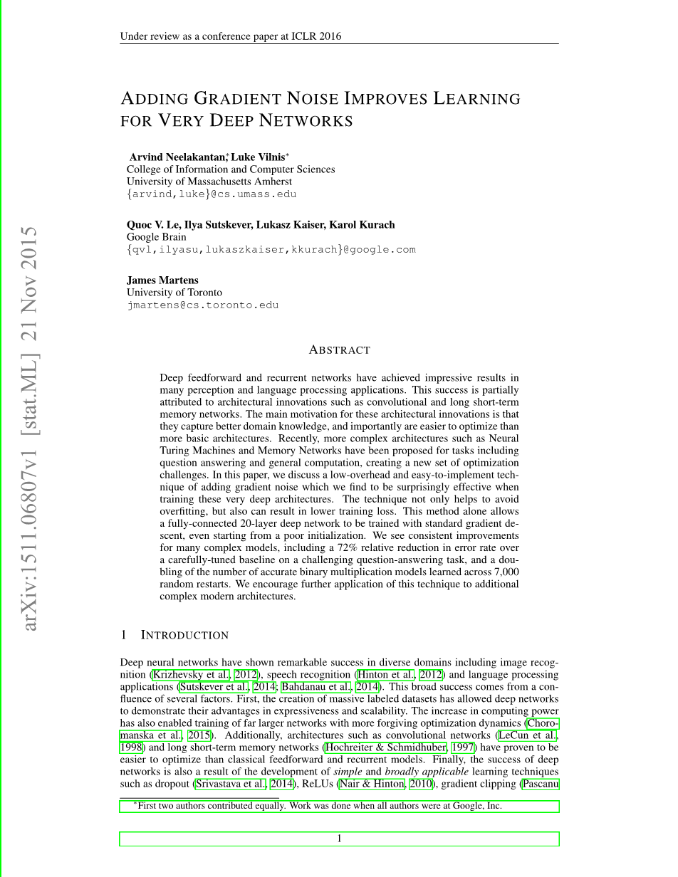 深入的前馈和复杂网络在许多感知和语言处理应用中取得了令人印象深刻的成果。这一成功部分归功于构架创新(建筑学的创新) 如卷积和长短期记忆网络。这些架构创新的主要动机是他们能够捕获更好的领域知识,重要的是它们比更多基础的架构容易优化。最近,更复杂的架构如神经图灵机和内存网络已经被提出了,包括应答和简单的计算在内的任务,创造一套新的优化挑战。在本文中我们讨论了一种低开销和易于实现的一种增加梯度噪声的技术,我们发现这有令人惊异的效果在练习这些深层架构时。该技术不仅可以避免过度拟合,还能达到训练损失减少的结果。这种方法允许20层深层网络通过标准梯度下降训练完全连接,甚至开始于初始化不良。我们看到许多复杂模型的持续改进,包括在挑战性的问题回答任务上精心调整的基线上的错误率相对降低了72%,并且在7,000次随机重启中学到的精确二进制乘法模型的数量翻了一番。我们鼓励将此技术进一步应用于更复杂的现代架构。