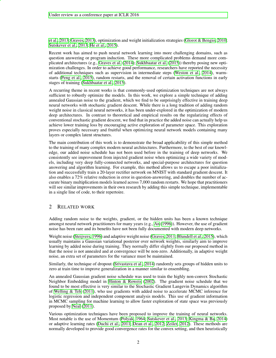 各种优化技术已经被提出来改进神经网络的训练。最值得注意的是动量的使用(Polyak, 1964; Sutskever等, 2013; Kingma amp; Ba, 2014) 或者适应性学习率(Duchi et al., 2011; Dean et al., 2012; Zeiler, 2012)。这些方法通常被发展来提供凸集的良好收敛速率,然后启发式地应用于非凸的问题。另一方面,把噪音注入梯度中更适合于非凸的问题。通过添加更多的随机性,这种技术给模型更多的机会逃避当地最小值(参见Bottou(1992)中的类似论点),或者通过早期学习的“暂态”高原阶段快速穿越(参见动量的类似分析 在Sutskever等(2013)。在我们的观察中,这是经验性地证明,增加梯度噪声实际上可以导致较低的训练损失。在这个意义上,我们猜想添加梯度噪声类似于模拟退火(Kirkpatrick等人,1983),它利用随机噪声来探索复杂的景观的优化。这可以与作为学习算法的随机梯度下降的众所周知的优点(Robbins和Monro,1951; Bousquet&Bottou,2008)进行对比,理论和实践都表明随机过程引起的噪声有助于通过减少过度拟合。