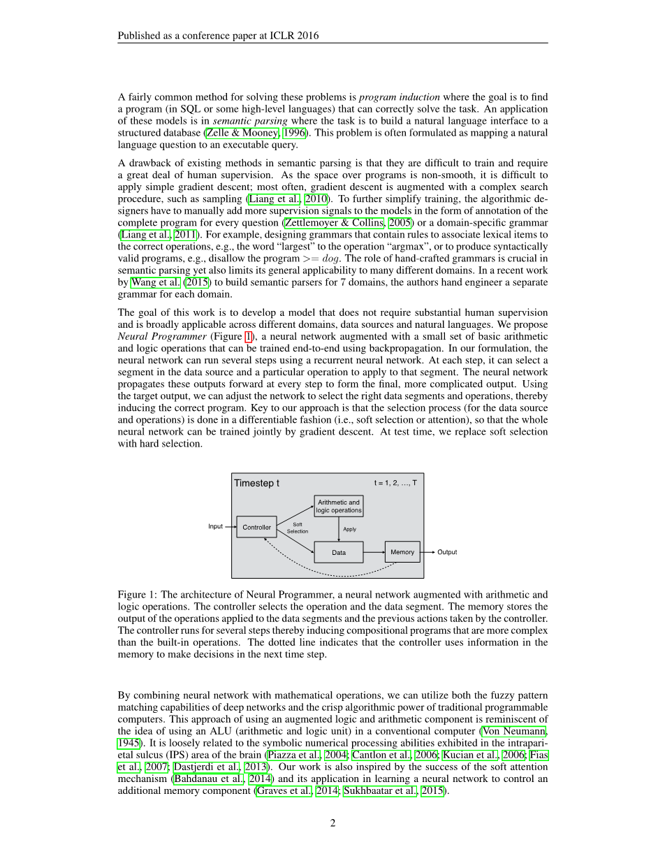 通过组合神经网络与数学运算,我们可以利用深度网络的模糊模式匹配能力和传统可编程电脑的清晰算法能力。 这种使用增强逻辑和算术分量的方法让人联想到在常规计算机中使用ALU(算术和逻辑单元)的想法(Von Neumann,1945)。 它与在脑的intraparietal沟(IPS)区域中显示的符号数值处理能力松散相关(Piazzaet al.,2004; Cantlon et al.,2006; Kucian et al.,2006; Fiaset al.,2007; Dastjerdi et al.,2013)。 我们的工作也受到软注意的成功的启发机制(Bahdanau et al.,2014)及其在学习神经网络中的应用额外的内存组件(Graves et al.,2014; Sukhbaatar et al.,2015)。