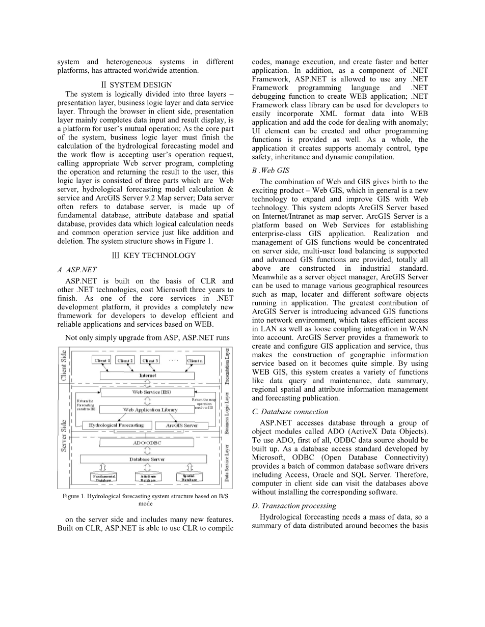 随着网络技术的不断发展,b/s(浏览器/服务器)模型应用系统逐渐变得更加成熟。b/s模型是一个建立在广域网和HTTP协议上的编程模式。客户端可以通过浏览器在服务器端完成大部分的逻辑处理来完全实现数据的输入和显示。作为一个如今在应用中普遍使用的模式,b/s的模式与用户的地理位置并没有什么关系,不需要为客户开发一个特殊的软件,同时对于客户配置和开发成本的要求也会更低,并且更加易于升级和维护。基于当前的网络和硬件基础设施,如何通过建设新一代多层次、跨平台、跨编程语言的分布式水文预报系统来解决不同平台的预报系统和异构系统的相互交互操作的问题,已经吸引了全世界的广泛关注。