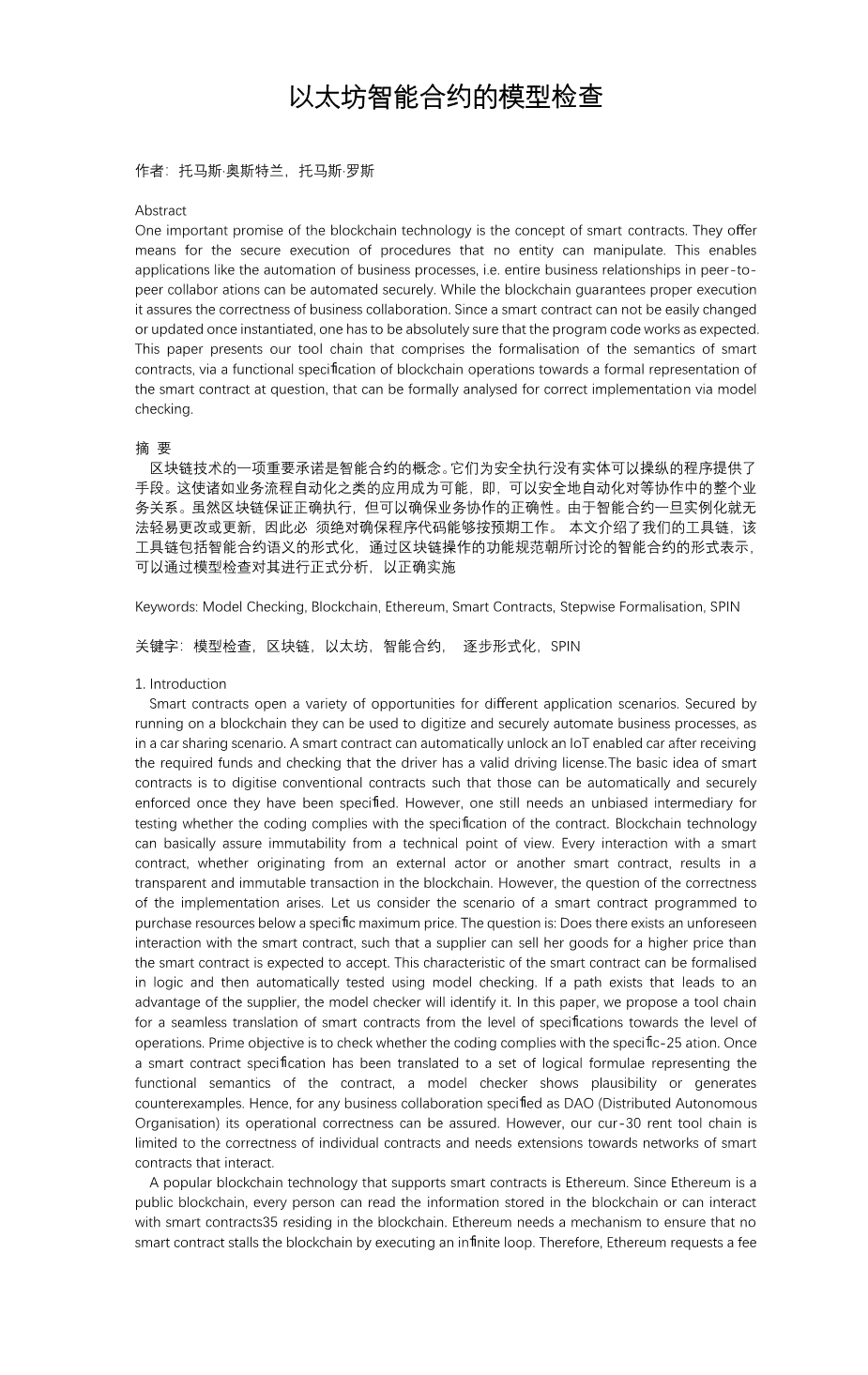 以太坊智能合约的模型检查外文翻译资料 2022-08-09 15:11:21 英语原文共 33 页,剩余内容已隐藏,支付完成后下载完整资料 英语译文共 23 页,剩余内容已隐藏,支付完成后下载完整资料 资料编号:[239085],资料为PDF文档或Word文档,PDF文档可免费转换为Word 原文和译文剩余内容已隐藏,您需要先支付 30元 才能查看原文和译文全部内容!立即支付 发小红书推广免费获取该资料资格。点击链接进入获取推广文案即可: Ai一键组稿 | 降AI率 | 降重复率 | 论文一键排版 PREVIOUS NEXT 您可能感兴趣的文章 使用金属伪影减少算法从 CT 数据生成的数字模型的准确性外文翻译资料 彩色光流外文翻译资料 云环境下基于虚拟机配置文件针对DDOS攻击的最优网络攻击探测方法外文翻译资料 监控大视频数据分析中的模糊逻辑: 综述、挑战和研究方向外文翻译资料 PeopleSoft人力资源管理系统实施外文翻译资料 图像绗缝的纹理合成与转移外文翻译资料 管理云中的资源:Chrome扩展到OpenStack外文翻译资料 一种基于凸显区域检测和SPBVM的美学QR码新算法外文翻译资料 微信小程序-所有你需要知道外文翻译资料 Java核心技术卷II高级特性外文翻译资料