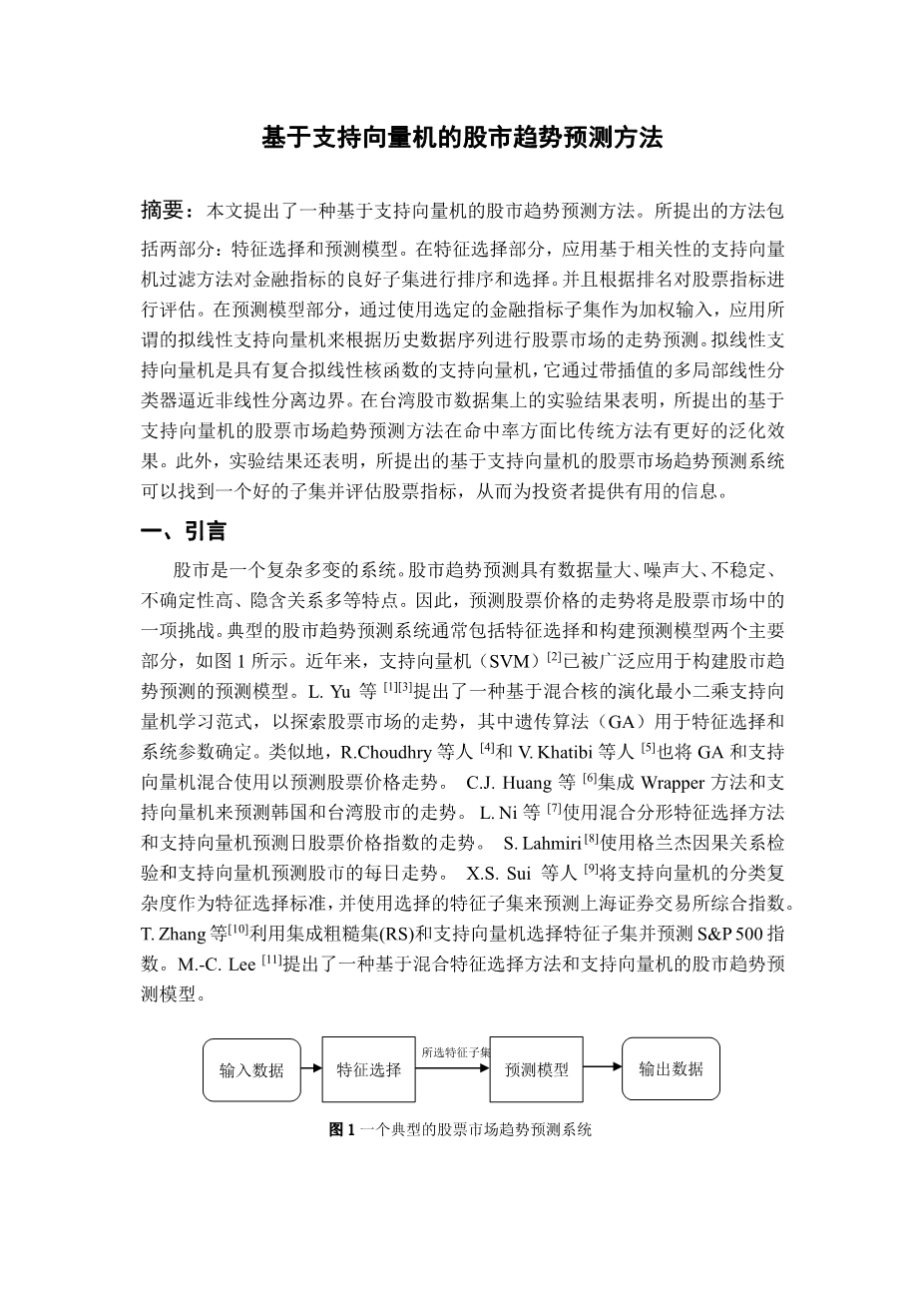 基于支持向量机的股市趋势预测方法外文翻译资料 2022-08-09 16:48:07 英语原文共 7 页,剩余内容已隐藏,支付完成后下载完整资料 英语译文共 15 页,剩余内容已隐藏,支付完成后下载完整资料 资料编号:[238791],资料为PDF文档或Word文档,PDF文档可免费转换为Word 原文和译文剩余内容已隐藏,您需要先支付 30元 才能查看原文和译文全部内容!立即支付 发小红书推广免费获取该资料资格。点击链接进入获取推广文案即可: Ai一键组稿 | 降AI率 | 降重复率 | 论文一键排版 PREVIOUS NEXT 您可能感兴趣的文章 使用金属伪影减少算法从 CT 数据生成的数字模型的准确性外文翻译资料 彩色光流外文翻译资料 云环境下基于虚拟机配置文件针对DDOS攻击的最优网络攻击探测方法外文翻译资料 监控大视频数据分析中的模糊逻辑: 综述、挑战和研究方向外文翻译资料 PeopleSoft人力资源管理系统实施外文翻译资料 图像绗缝的纹理合成与转移外文翻译资料 管理云中的资源:Chrome扩展到OpenStack外文翻译资料 一种基于凸显区域检测和SPBVM的美学QR码新算法外文翻译资料 微信小程序-所有你需要知道外文翻译资料 Java核心技术卷II高级特性外文翻译资料