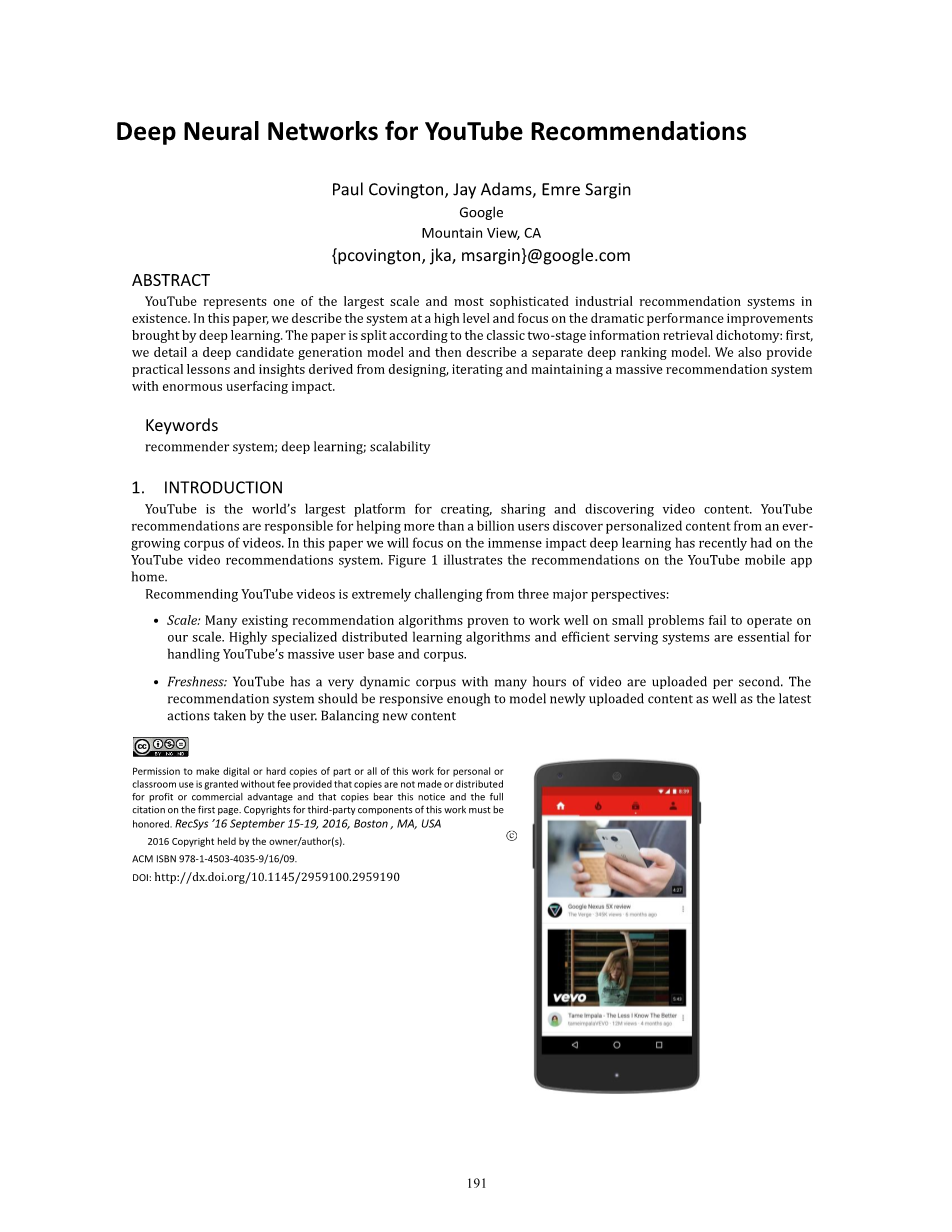 YouTube 代表了目前规模最大,最复杂的行业推荐系统之一。 在本文中,我们从较高的角度描述了该系统,并着重讨论了深度学习带来的显着性能提升。