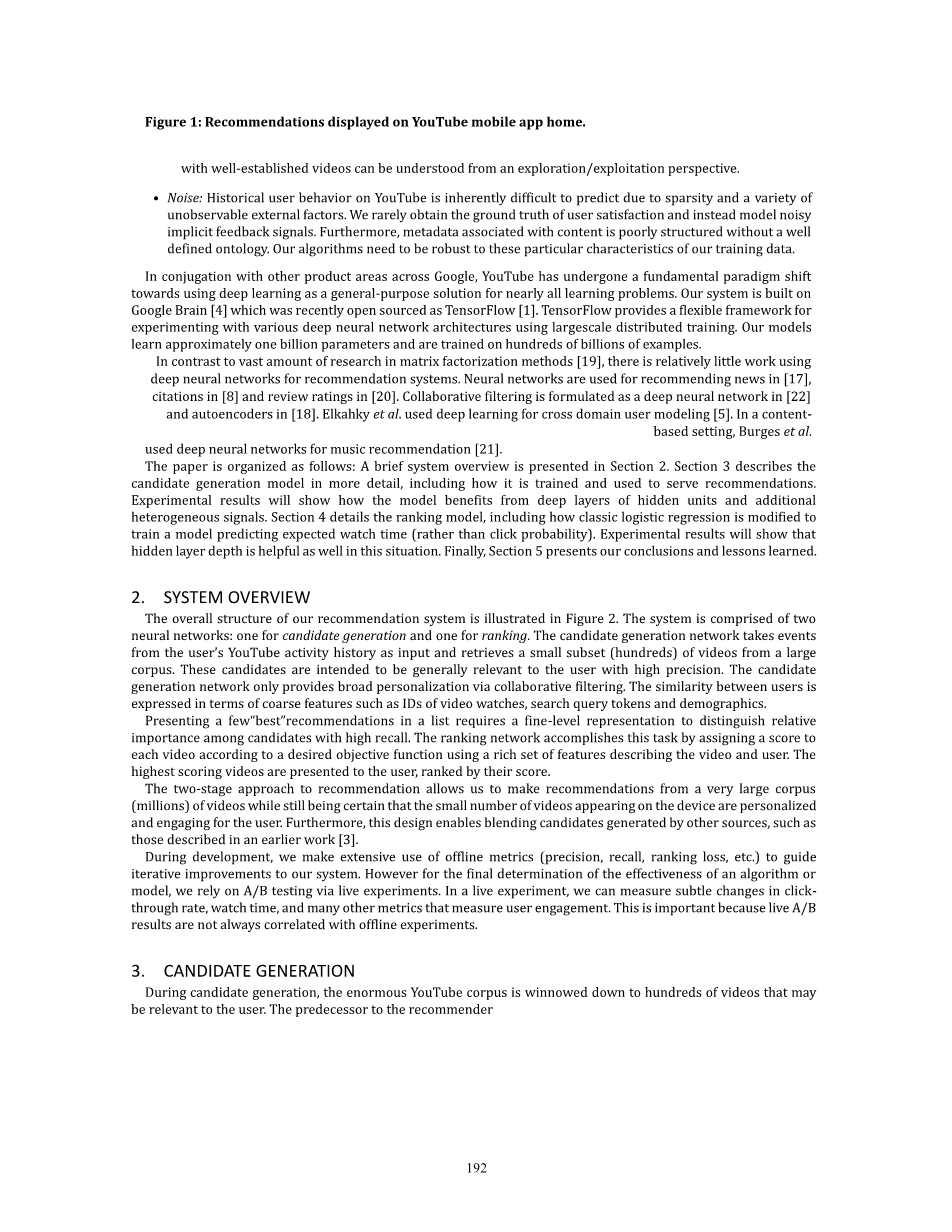 本文的组织结构如下:在第 2 节中进行了简要的系统概述。第 3 节更详细地描述了候选代模型,包括如何训练候选者模型以及如何使用它来提供建议。 实验结果将显示该模型如何受益于隐藏单元的深层和其他异构信号。 第 4 节详细介绍了排名模型,包括如何修改经典逻辑回归以训练模型以预测预期观看时间(而非点击概率)。 实验结果表明,在这种情况下,隐藏层的深度也是有帮助的。 最后,第 5 节介绍了我们的结论和经验教训。