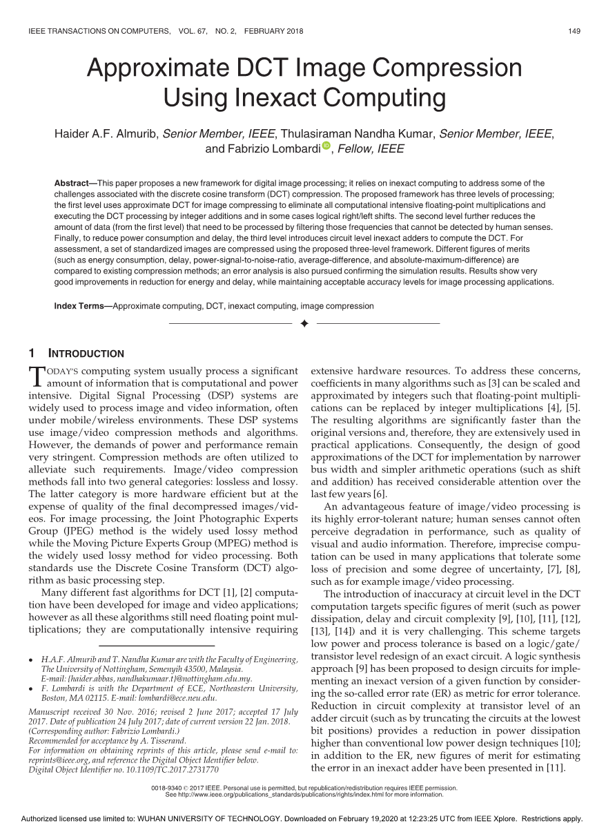 摘要──本文提出了一种新的数字图像处理框架。 它依靠不精确的计算来解决与离散余弦变换(DCT)压缩相关的一些挑战。 提议的框架具有三个处理级别: 第一级使用近似DCT进行图像压缩,以消除所有计算密集型浮点乘法,并通过整数加法(在某些情况下为逻辑右移/左移)执行DCT处理。 第二级通过过滤人类感知无法检测到的频率,进一步减少了需要处理的数据量(来自第一级)。最后,为了降低功耗和延迟,第三级引入了电路级不精确加法器来计算DCT。 为了进行评估,本文使用提出的三级框架压缩了一组标准化图像,将不同的优劣指标(例如能耗,延迟,功率信噪比,平均差和绝对最大差)与现有压缩方法进行了比较,还进行误差分析以确认仿真结果。 结果表明,本文提出的方法在减少能量和延迟方面取得了非常好的改进,同时保持了图像处理应用可接受的精度水平。