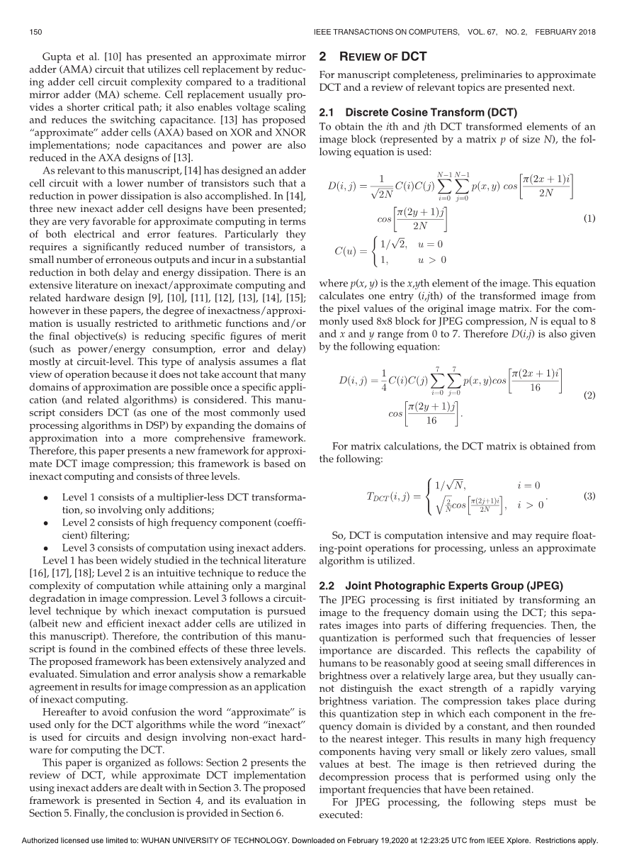 本文的组织结构如下:第2节介绍了DCT,第3节介绍了使用不精确加法器的近似DCT实现。第4节介绍了建议的框架,第5节介绍了其评估。最后,结论是在第6节中提供。
