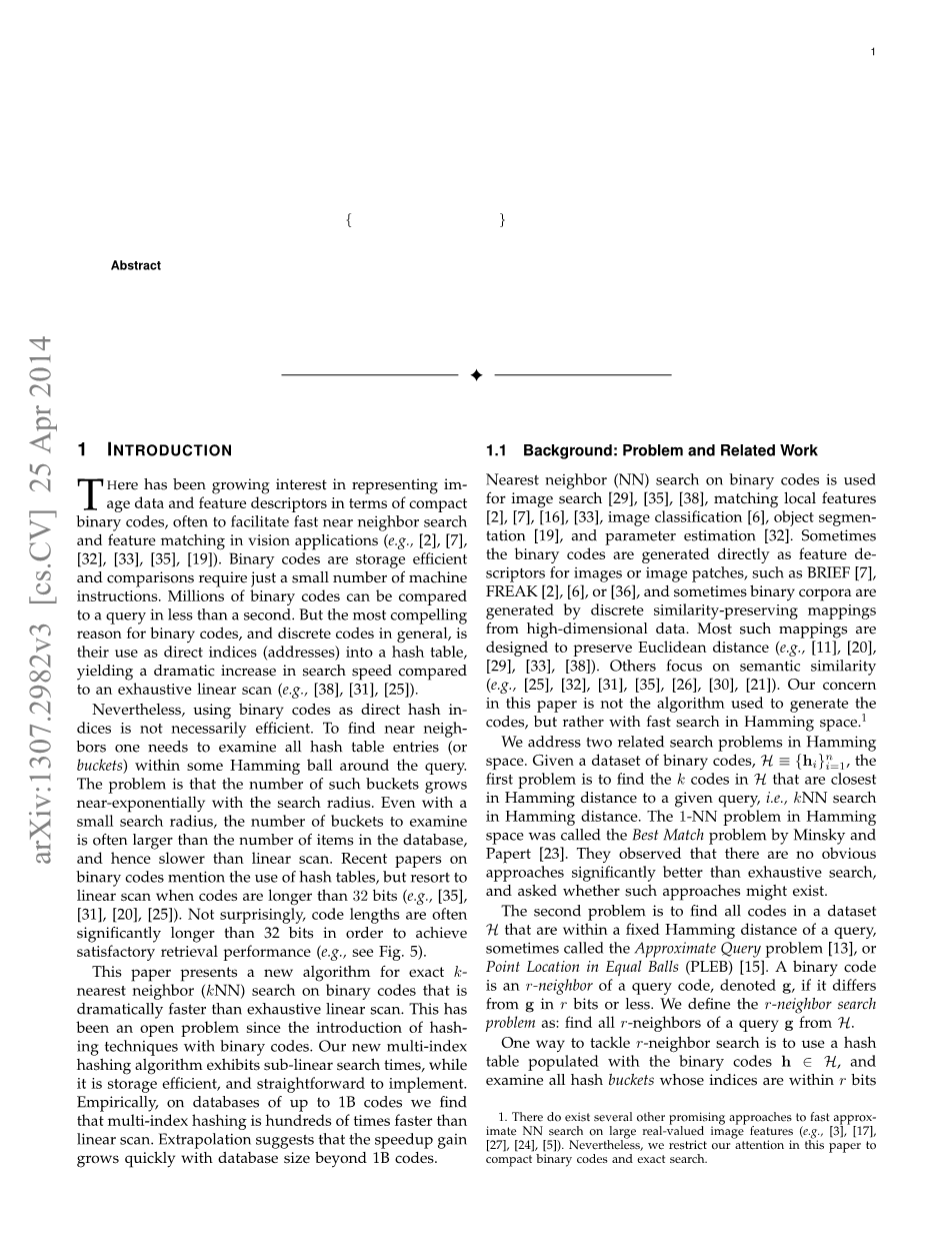 对二进制串的最近邻(NN)搜索用于图像搜索[29],[35],[38],匹配局部特征[2],[7],[16],[33],图像分类[6],对象分割[19]和参数估计[32]。有时,二进制串直接生成为图像或图像补丁的特征描述符,例如BRIEF或FREAK [2],[6],[7],[36],有时二进制语义是通过从高维数据中离散相似性保持的映射生成的。大多数这样的映射被设计为保留欧几里德距离(例如[11],[20],[29],[33],[38])。其他人则关注语义相似性(例如[21],[25],[26],[30] – [31] [32],[35])。本文我们关注的不是生成代码的算法,而是在汉明距离上的快速搜索。1