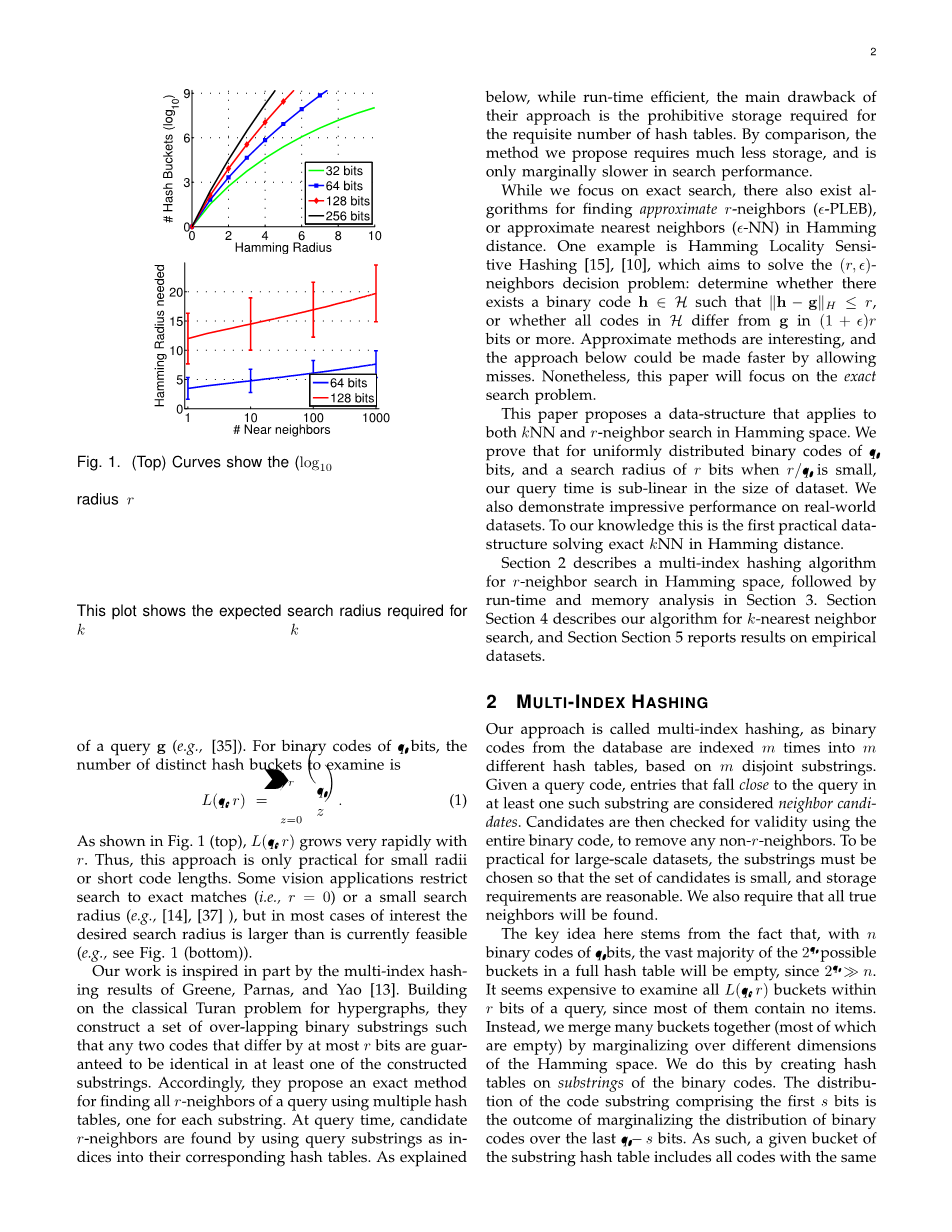 正如图1上部图片(q,r)随着r递增,因此,这种方法之对于小半径搜索或者串长度短有效。有些视觉应用将搜索限定在完全匹配或者小搜索半径之内,但是在大多数情况下感兴趣的搜索半径比当前可行的要大(例如,图一下部图片)。