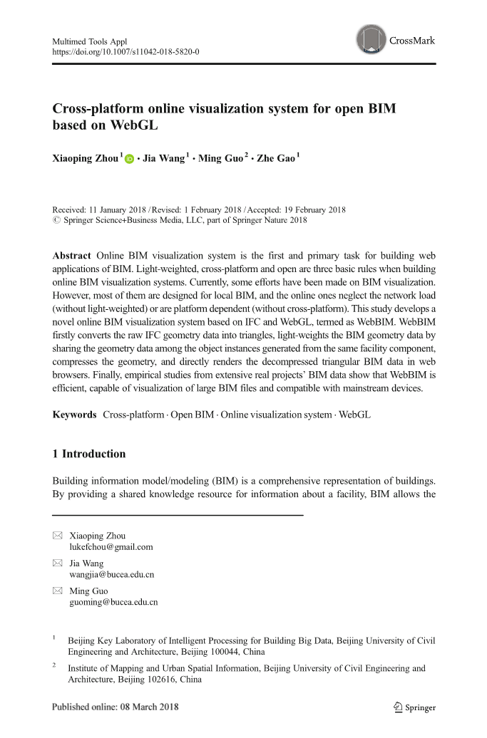 虽然在基于IFC的BIM可视化方面已经做了一些工作,但是忽略了网络因素和移动设备有限的资源,阻碍了它们在广泛场景中的应用。本文利用WebGL开发了一个开放式BIM的跨平台在线可视化系统WebBIM。