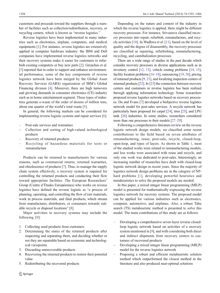 过去十年中,广泛的研究认为,在不同的应用程序中应考虑恢复过程,如在库存控制 [12,13],车辆路径问题[14,15],设施选址问题[16-18],外包[19,20],定价的返回产品[21],和本地化的产品检验中心[22]。在[23]逆向物流中,回收中心与客户之间的联系已通过应用信息技术实现。一些研究人员提出了基于回收过程的逆向物流网络。Du and Evans [ 7 ]开发了一种双目标的逆向物流网络模型的售后服务。地毯[24],轮胎[25],液化石油气储罐[26]等行业中回收网络已特别被提出。在一些研究中,研究人员认为,在他们的模型中至少有一个以上的过程[27-29]。