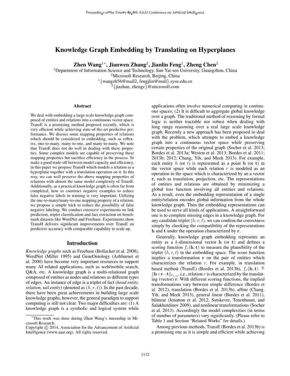 本文的工作是将一个由实体和关系组成的大型知识图谱嵌入到连续的向量空间。TransE是当下非常流行的一个算法,不仅相当高效,而且有着目前最先进的预测性能。本文讨论在知识图谱嵌入时应当考虑的关系映射属性,例如:关系反射性,1-N、N-1、N-N这样的复杂关系。然而TransE在这些属性上表现的不够理想。一些复杂模型以牺牲效率为代价来试图解决这些映射属性问题。为了平衡算法的复杂度和效率,本文提出了TransH模型。该模型将关系看作为一个超平面,在超平面上作平移操作。TransH可以在保持跟TransE同复杂度的前提下,解决关系映射属性的问题。此外,实际上的知识图谱是很难真正完成的,如何构造负样本减少在模型训练中的假阴性率是很重要的。利用关系的1-N/N-1映射属性,本文提出了一个小技巧来试图降低假阴性率。本文还在WordNet和Freebase基础数据集上对链接预测、三元组分类和关系事实抽取进行了广泛的实验。实验表明,TransH与TransE相比,预测的准确性和算法处理能力都有了显著的提高。