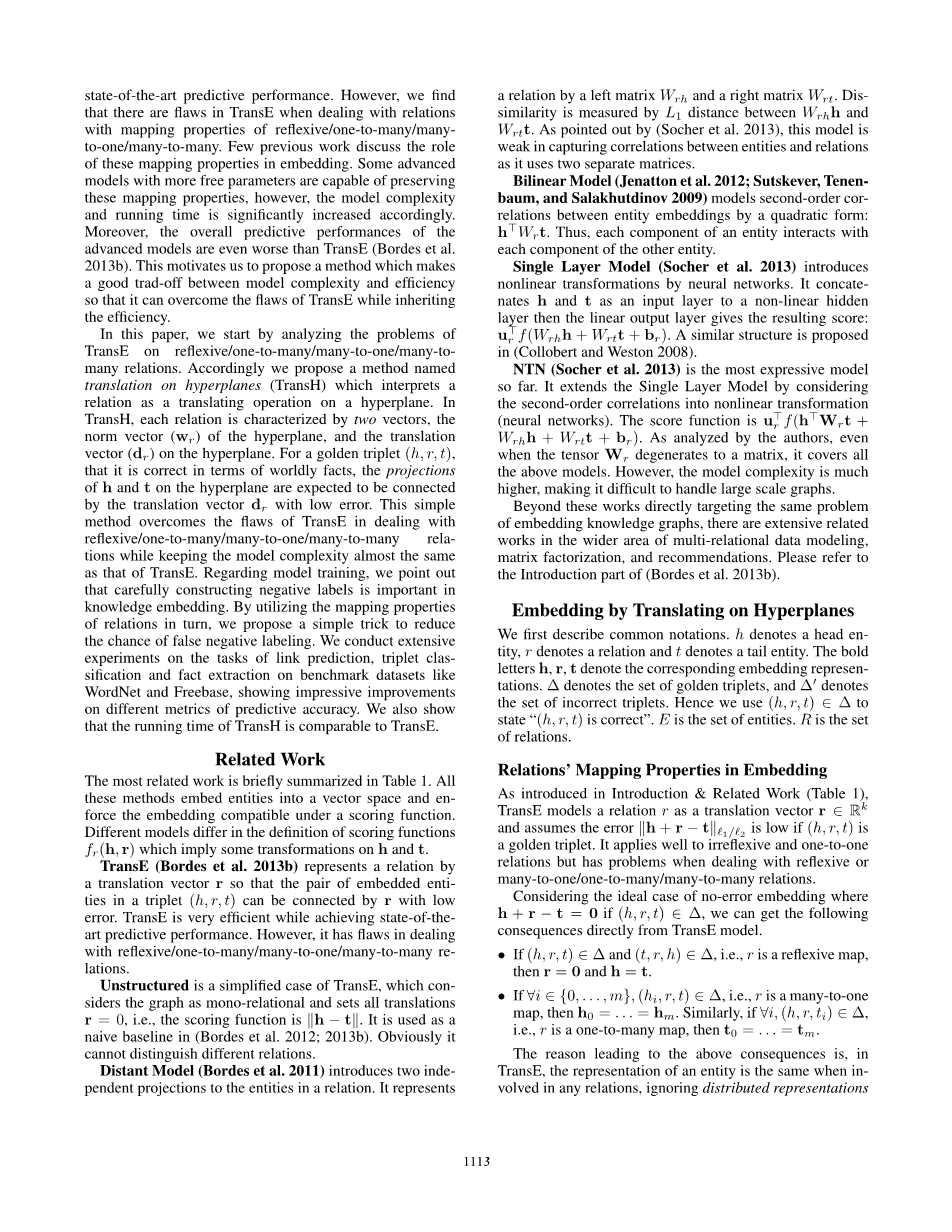 在上文所述的方法中,TransE(Bordes et al.2013b)是最有希望的,因为它不仅简单有效,还有着目前最先进的预测性能。然而,TransE在处理关系的反射性/1-N/N-1/N-N这些映射属性时存在缺陷。上文已经讨论了这些映射属性在嵌入时扮演的角色。一些有更多参数的先进模型能保护这些映射属性,但是时间复杂度也相应的显著增高。并且这些模型的预测性能比TransE差(Bordes et al.2013b)。这就驱使我们提出一种平衡算法的计算能力和效率的方法,能在继承TransE效率的同时克服它的缺陷。