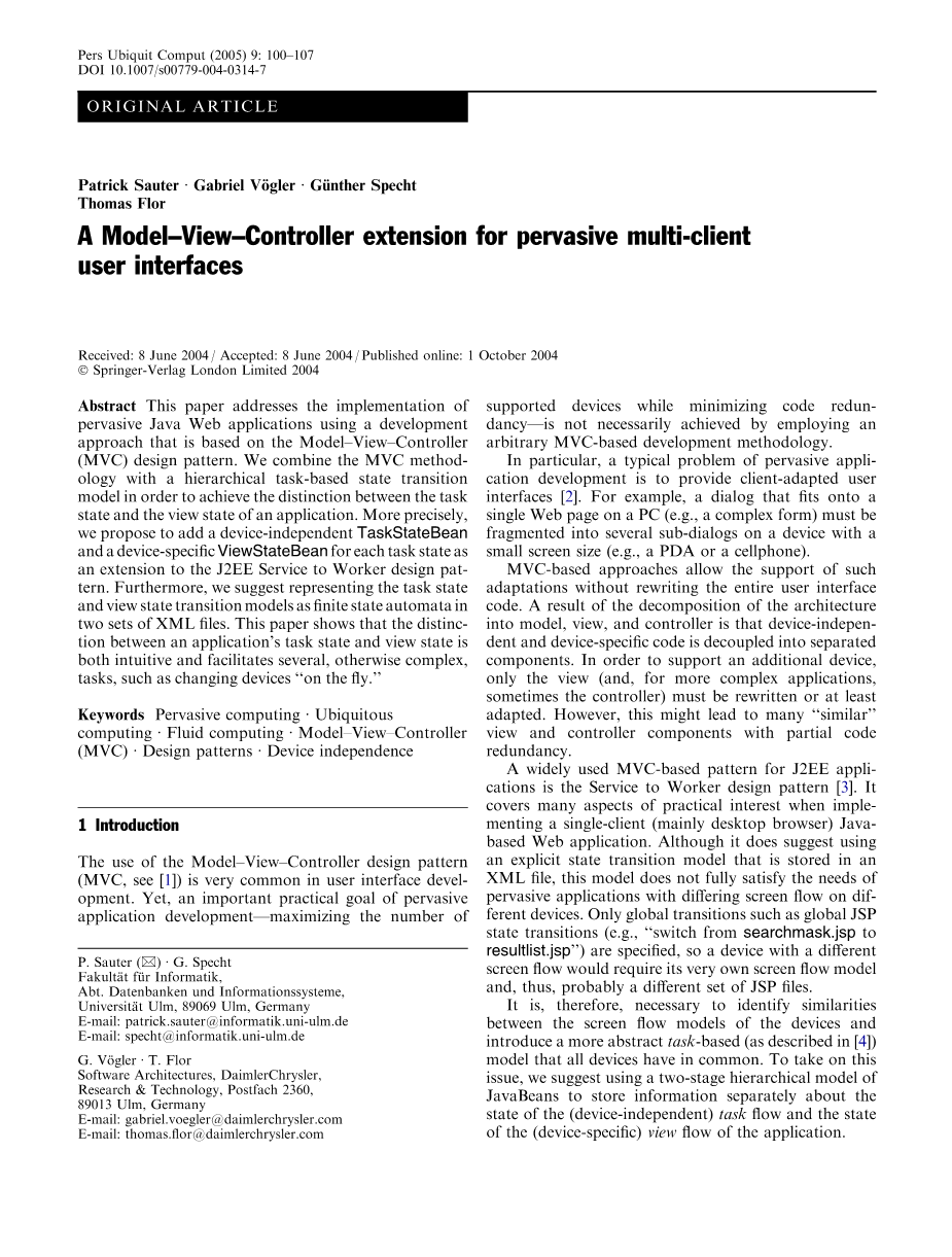 一个基于MVC设计模式的J2EE程序的广泛应用是:将服务作为设计模式。这种方法覆盖了开发一个单独客户端的JAVA WEB程序的多个方面。尽管这个模式是建议用一个明确的状态状态转移模型来讲信息存储到一个XML文件中,但这个模型在普适程序中处理由不同设备引起的屏幕差异并不十分让人满意。其仅仅规定好了如何像转变总体JSP文件(例如:将“searchmask.jsp”转换为“resultlist.jsp”)一样转变系统整体状态。所以,在一个设备上的不同的屏幕流将需要非常自主的屏幕流模型。而且,可能需要一个不同的JSP文件集。