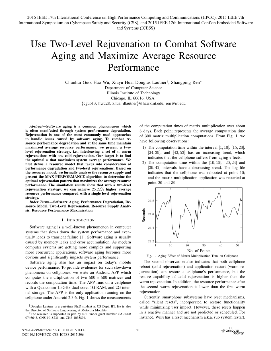 软件老化是计算机中的一个常见现象,表现为系统性能减慢,并最终导致瞬态故障。软件老化通常是由内存泄漏和错误积累造成的。随着现代计算机系统变得越来越复杂和支持更多的并发应用,软件老化更加明显和显著地影响系统的性能。软件老化也影响了今天的移动设备的性能。为此类在手机上的减速现象提供证据,我们写了一个Android应用程序计算两个500times;500矩阵的乘法并记录计算时间。应用程序运行在高通1.5GHz双核,1G内存,和2G内存储手机上。应用程序是唯一运行在Android 2.3.6手机的应用程序。图1显示了超过5天的矩阵乘法运算次数的测量。每个点代表平均计算时间300矩阵乘法运算。从图1,我们有以下观察:
