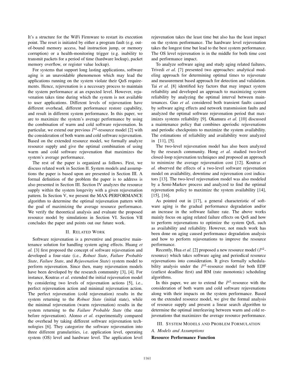 Guo et al。 考虑了由软件老化效应和网络传输故障引起的瞬态故障,并分析了使系统可靠性最大化的最佳软件再生周期[9]。 Okamura et al。 [10]讨论了一个维护策略,结合了非周期性复兴和周期性检查点,以最大化系统可用性。 分析了可靠性和可用性的估计在[11],[5]。