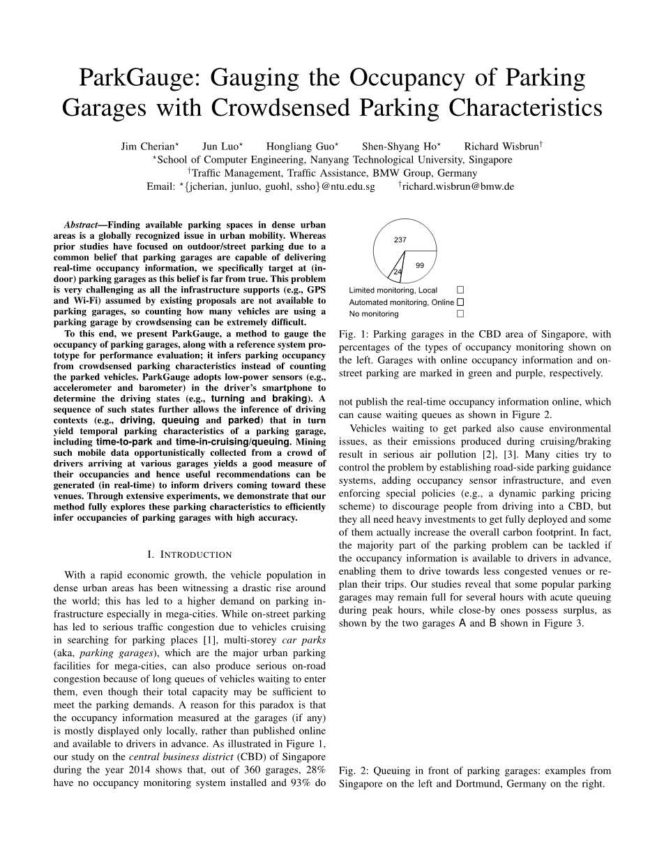 在本文中,我们提出ParkGauge,一种方法来衡量停车场在城市地区的占用方法。为了应用惯性感测用于此目的,ParkGauge创新地使用(时间序列)驾驶状态(例如:制动和转弯)来推断停泊特征(例如:停车时间,入库时间),来推断车位的占用与否。据我们所知,ParkGauge是第一种使用时间信息来高效地和有效地指示室内停车场的停车占用的方法1。