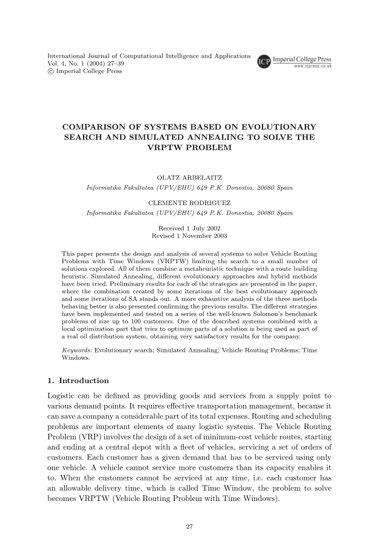 本文提出了求解限制搜索小数量级解决方案的带时间窗的车辆路径问题(VRPTW)的几种方法的分析与设计。所有这些方法将现代启发式算法结合启发式算法的。模拟退火,尝试了不同的进化方法和混合方法。每个策略的初步结果,最好的进化方法和SA的一些迭代创建的组合脱颖而出。关于三种方法表现得更好的一份更详尽的分析报告也证实了以前的结果。不同的策略已经实施并测试了一系列著名的大小多达100个客户的所罗门的基准问题。所描述的方法相结合的局部优化部分,试图优化局部的解决方案正在被一个真正的石油分销方法的一部分使用的,为公司获得非常满意的结果。