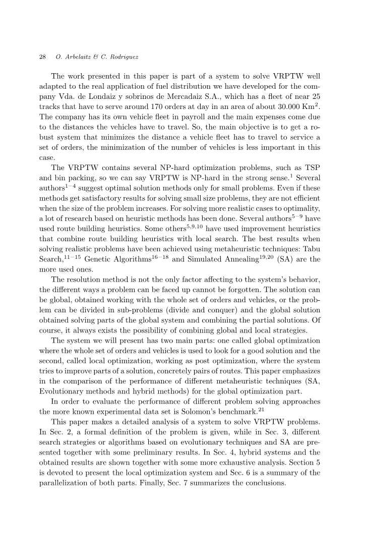 本文为解决VRPTW问题对方法进行详细的分析。第2部分,给出问题的正式定义。而在第3部分,展示建立在进化方法和SA基础上不同的搜索策略或算法的一些初步结果。第4部分,详述混合方法和所得到的结果并做一些更详尽的分析。第5部分致力于提出局部优化和第6部分是两部分并行化的总结。最后,第7部分总结结论。