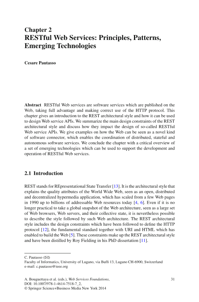 摘要 RESTful Web服务是在Web上发布的软件服务,充分利用并正确使用HTTP协议。本章介绍REST架构风格,以及如何使用它来设计Web服务API。我们总结了REST架构风格的主要设计约束,并讨论它们如何影响所谓的RESTful Web服务API的设计。我们举例说明如何将Web看作是一种新型的软件连接器,它能够协调分布式,有状态和自主的软件服务。我们总结了一章,一个关键概述一组新兴技术,可用于支持RESTful Web服务的开发和操作。