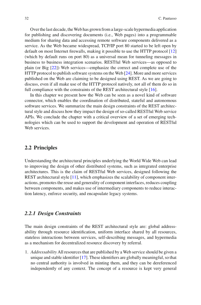 在本章中,我们将介绍如何将Web看作是一种新型的软件连接器,它能够协调分布式,有状态和自主的软件服务。我们总结了REST架构风格的主要设计约束,并讨论它们如何影响所谓的RESTful Web服务API的设计。