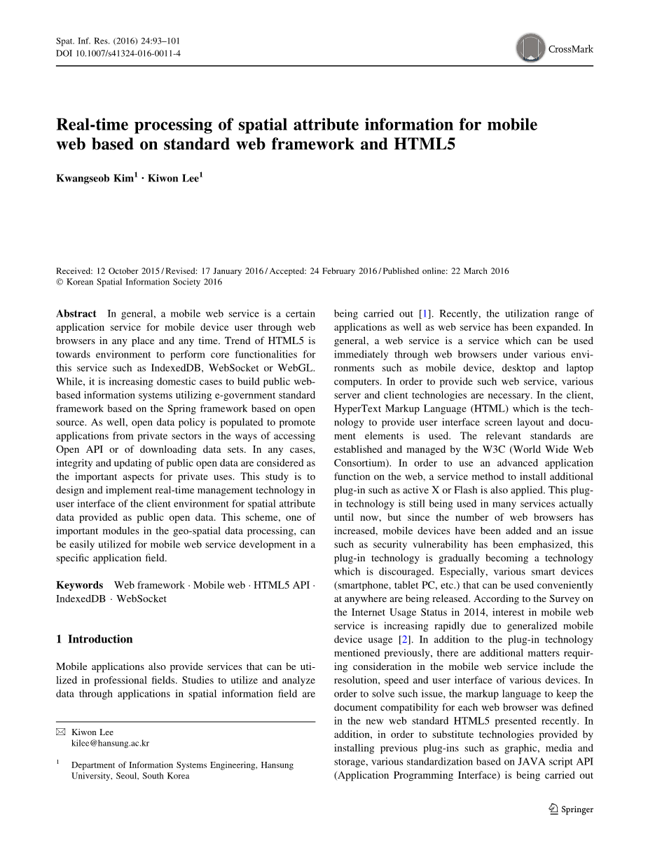 HTML5作为W3C Web标准发布,以维护各种Web浏览器中的文档兼容性。与此同时,Java脚本API技术可实现高级应用程序功能,该功能需要先前安装插件才能运行,而无需安装此类插件。 也被释放。 HTML5中包含的功能是二维和三维图形表达式,可以保存数据以启用联机和脱机数据使用的数据库以及Web通信技术。 在这项研究中,利用了可以保存数据以实时管理空间和属性信息的IndexedDB以及基于HTML5的Java脚本API之间进行实时通信的WebSocket技术。