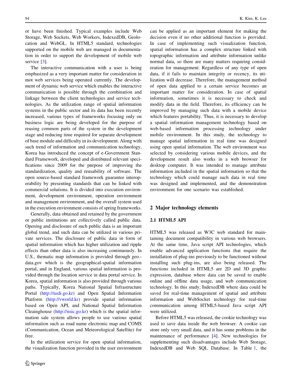 在此外,为了替代技术提供的安装以前的插件,如图形,媒体和存储,基于JAVA脚本API的各种标准化(应用程序编程接口)正在进行中典型的例子包括Web存储,Web套接字,Web工作者,IndexedDB,地理位置和WebGL。在HTML5标准中,技术在移动网络上支持的文件是由文件管理的以支持移动网络的发展服务[3]。与用户的交互式通信正在进行中强调作为一个非常重要的事项供考虑目前正在运行mot web服务。发展动态网络服务,使互动通过组合和通信是可能的客户技术和服务技术之间的联系。作为空间信息的利用范围最近公共部门的系统及其数据已经公布增加,各种类型的框架只关注业务逻辑正在为此目的而开发在开发过程中重用系统的公共部分阶段和减少分开发展所需的时间的基础模块和开发难度。随着这种信息和通信技术的趋势,韩国引入了电子政务标准的概念框架,开发和分发相关的特定项目,自2009年以来为了改善目的而采取的措施标准化,软件的质量和可重用性。该基于开放源代码的标准框架保证了互操作性通过提出可与之相关的标准商业解决方案它分为执行环境,开发环境,运营环境和管理环境,以及整个系统的使用情况在执行环境中由spring框架组成。一般来说,政府获得并保留的数据或公共机构统称为公共数据。公开数据的公开和披露是重要的全球趋势,这些数据可以用于各种私人领域服务。以公开形式披露公共数据空间信息具有较高的利用率和波动性效果比其他数据也在不断增加。在美国的专题地图信息是通过geo.-data.gov是地理空间信息门户网站,并在英国提供各种空间信息通过数据门户服务中的位置服务。在韩国也通过各种方式提供空间信息路径。通常,韩国国家空间基础设施Portal(http://nsdi.go.kr)和Open Spatial Information平台(http://vworld.kr)提供空间信息基于Open API和国家空间信息Cleainghouse(http://nsic.go.kr)是空间信息销售系统可以让人们使用各种空间信息,如道路名称电子地图和COMS(通信,海洋和气象卫星)免费。在开放空间信息的使用服务中,即使没有提供其他附加功能,用户环境中提供的可视化功能也可以作为做出决定的重要元素。在实现这种可视化功能的情况下,与普通数据不同,空间信息具有与地形信息和属性信息相联系的复杂结构,因此有许多需要考虑管理的事项。不管任何类型的公开数据,如果它不能保持完整性或新近性,其利用率将会降低。