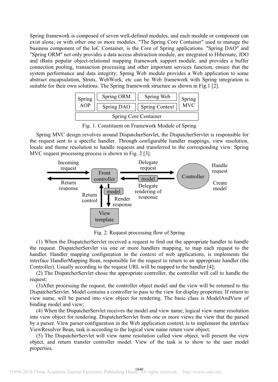 Spring使用注入和结构的设定值,通过配置文件管理的注入机制来形成协作对象,创建IoC容器的结构组件。该Spring框架由七个定义明确的模块组成,每个模块或组件可以单独存在,也可以与其他一个或多个模块一起存在。用于管理IoC容器业务组件的“Spring核心容器”是Spring应用程序的核心。 “Spring DAO”和“Spring ORM”不仅提供了一个数据访问抽象模块,它们集成到Hibernate,JDO和iBatis流行的对象关系映射框架支持模块中,并提供了缓冲连接池,事务处理等重要服务功能,确保系统性能和数据完整性; Sprnig Web模块提供了一个Web应用程序来进行一些抽象封装,Struts,WebWork等都可以与Web框架一起使用,Spring集成适合他们自己的解决方案。 Spring框架结构如图1所示[2]。